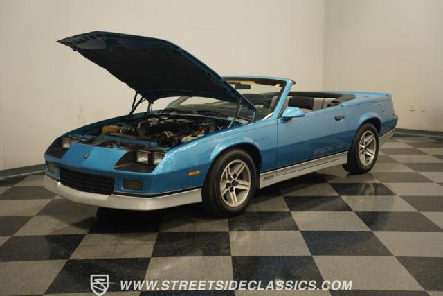 Modified from its factory origins, this 1988 Chevrolet Camaro RS Convertible has been transformed into an IROC tribute with a full repaint in factory Bright Blue. The black vinyl convertible top creates a distinct two-tone effect with the vibrant exterior, complemented by gray IROC-Z decals applied with precision. Dark headlight buckets and full Z/28 badging further enhance the visual update. The 16\" factory wheels fill the wheel wells nicely and come wrapped in 225/60R16 tires for proper grip and handling. Every angle of this third-generation F-body shows the careful attention put into its IROC transformation.