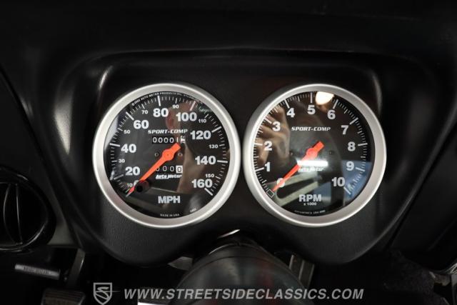 Black and red always go together just right, so the black interior fits perfectly. Front bucket seats combined with a nice center console host an easy-to-reach shifter that makes slamming gears exhilarating. The door panels, carpets, and dashboard are all in good shape. There are no rips, tears, or sagging in the headliner, and the rear bench seat looks like it has barely been used. Autometer gauges fill the gauge cluster, along with an additional set mounted under the dash. The AM radio and climate control portion of the dashboard appears original, which helps promote a retro look while mixing in an old-school, classy vibe.