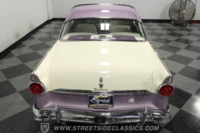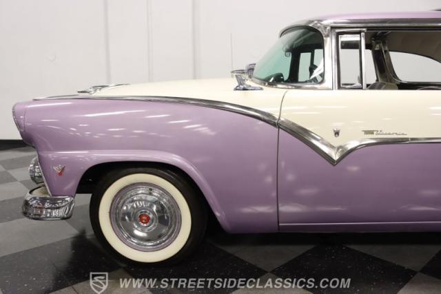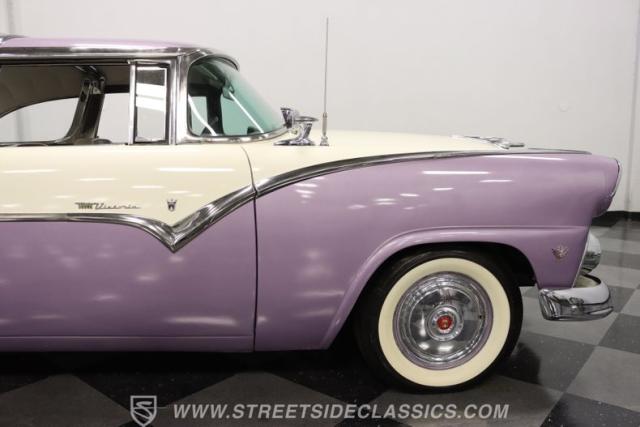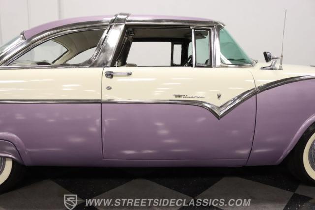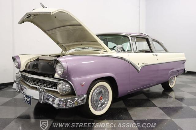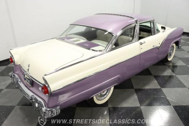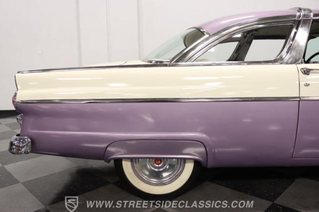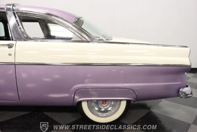 Rarity and distinction are at the heart of this cruiser. The trim tag tells us the Regency Purple and Snowshoe White is the factory-correct two-tone. We can\'t recall the last time we\'ve seen a Ford in this lilac-like hue, but it\'s unforgettable for its terrific gloss and smooth feel on this well-restored coupe. And the creamy white is given a well-defined separation that\'s to Fairlane\'s sweeping side trim. And on a body this well done, it looks like an almost unbroken line running down the profile. But what you\'ll really love is how only the Crown Victoria has brightwork that goes over-the-top (literally) with a band of chrome on the B-pillar that visually separates the front and rear passenger compartments. Wraparound chrome bumpers, whitewall tires, fender skirts, and jet-inspired tail lights make for a great vintage total package. But those polished exhaust tips hint at something fun under the hood (more on that in a moment.)