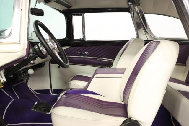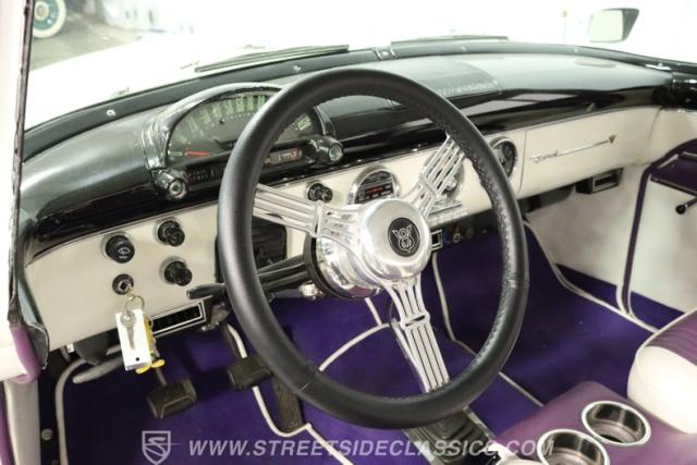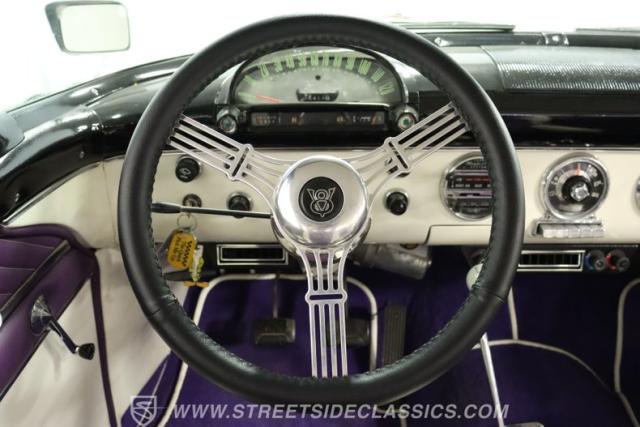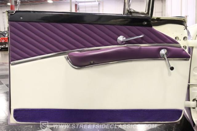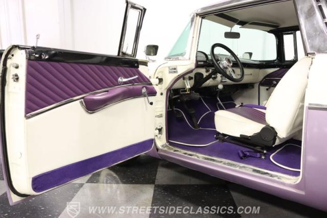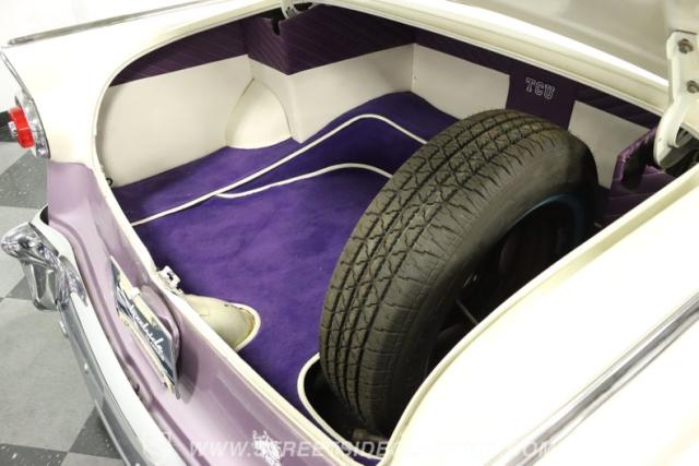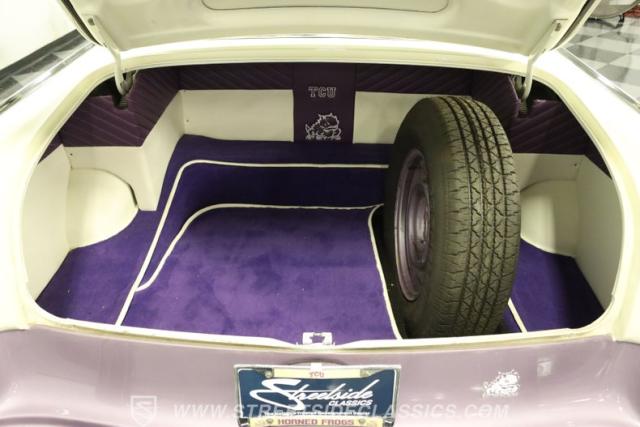 The interior is a comprehensive custom style. After all, the 1950s were known for great colors, but even back then there wasn\'t anything as vibrant as this. The purple and white two-tone is inspired by the exterior color theme, but it has a freshness that tells you it\'s a newer addition from the restoration. And you\'ll love the details, like the right sticking pattern and the white piping on the purple carpeting. There are nice features for easy cruising like a cup holder center console and cold-blowing air conditioning. Plus, the banjo-style sports steering wheel, Hurst shifter, and well-bolstered front bucket seats make for a better driver\'s classic. Even with all these upgraded features, you can still get the right classic details - including the plexiglass window speedometer. If you haven\'t already figured out the color theme, the stitching on the center console tells you this has been inspired by the colors for TCU. But you don\'t need to be a horned frogs fan to enjoy this Crown Vic. After all, it doesn\'t take much to replace the TCU logos. So even a Baylor fan can appreciate the rare/correct exterior color combo and the interior\'s coordination.