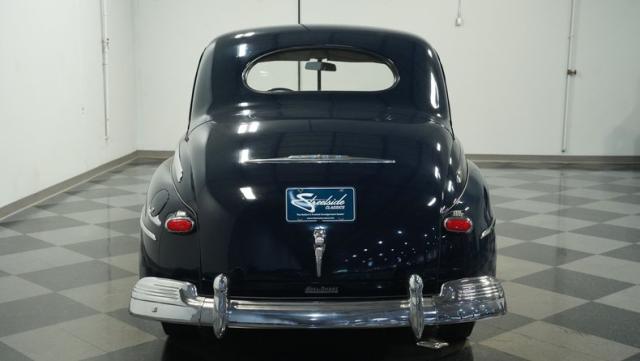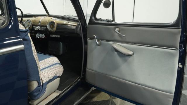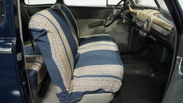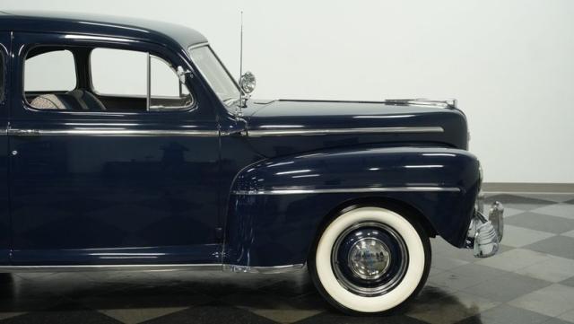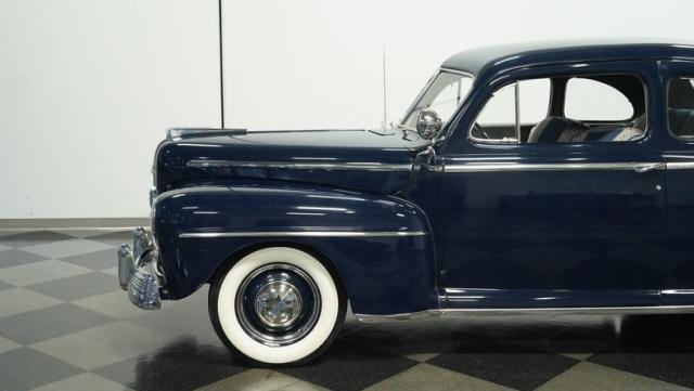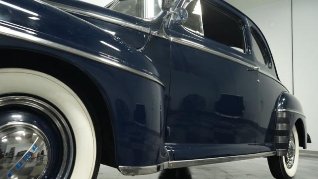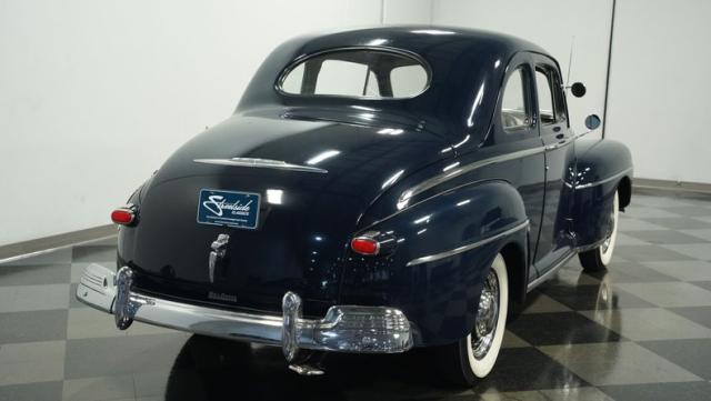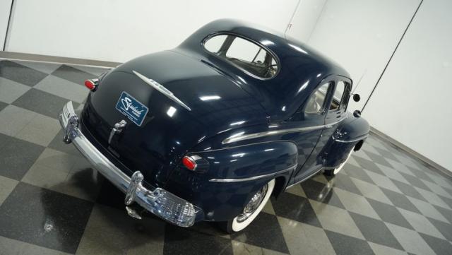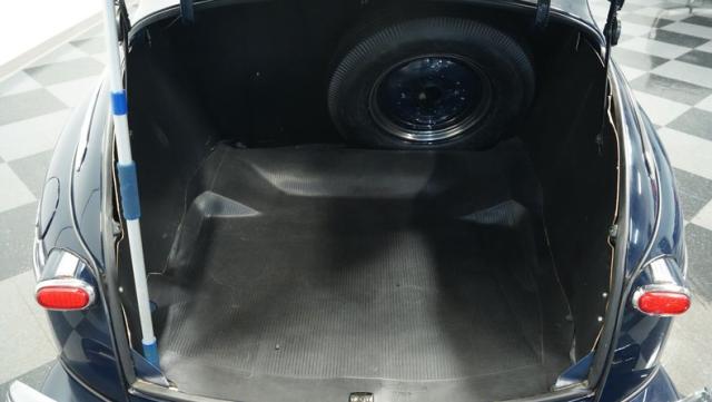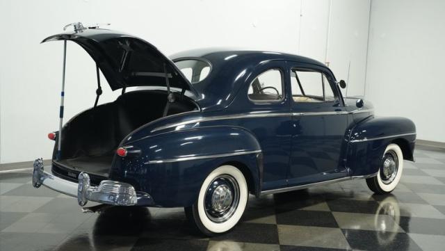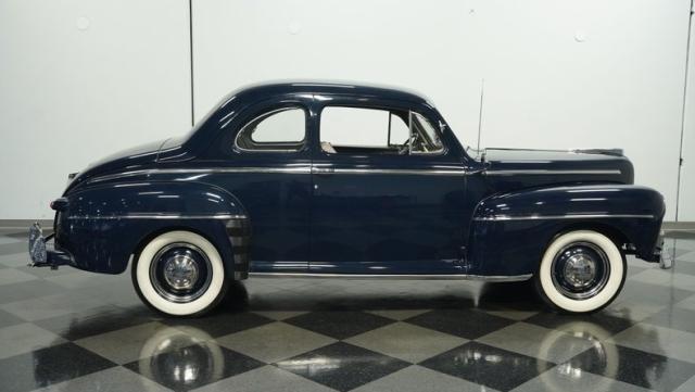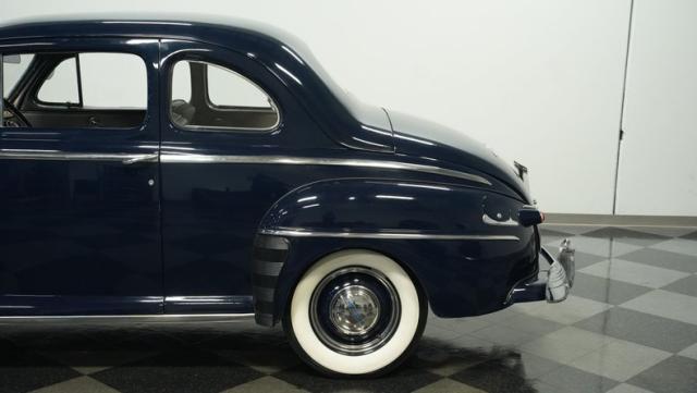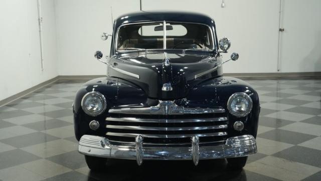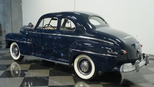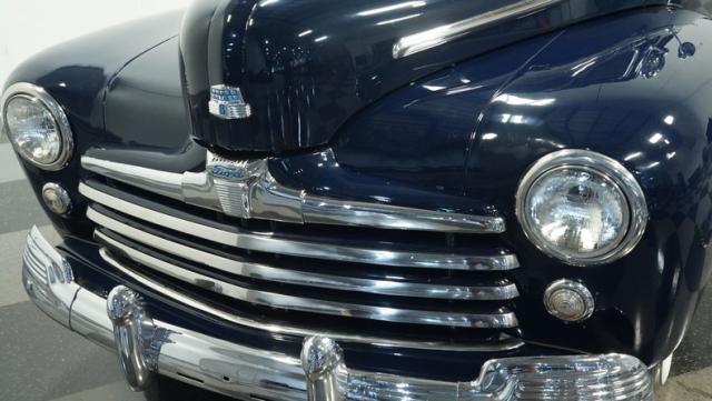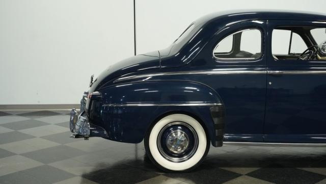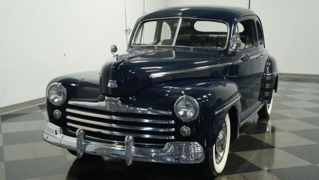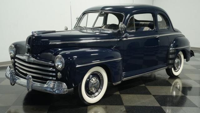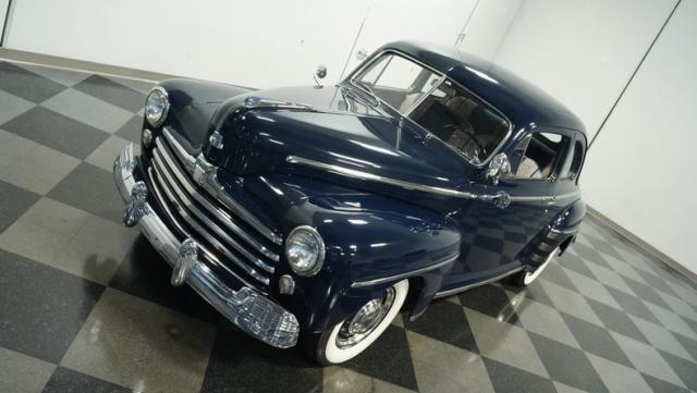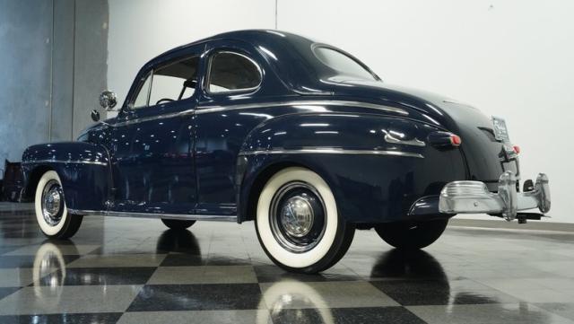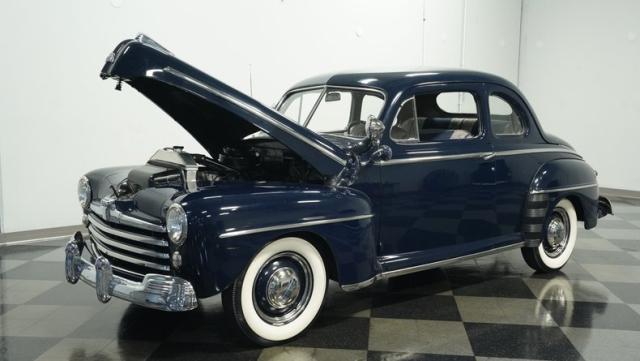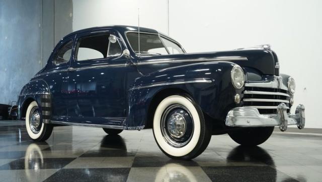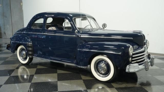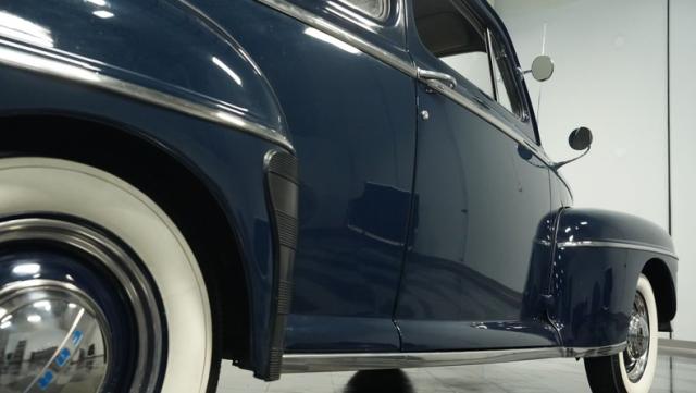 With its classic lines and dark blue paint, this 1947 Ford Super Deluxe Coupe is a true gentleman\'s ride from the post-war era. The Super Deluxe trim package, complete with full-length side trim, an iconic hood ornament, and chrome window surrounds, sets it apart as a top-of-the-line model. Rolling on period-correct 16\" wheels wrapped in 6.00-16 BFGoodrich Silvertown tires and featuring LED tail lights and turn signals, it\'s got the look, stance, and modern touches that\'ll make you the envy of any car show.