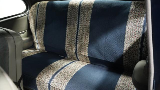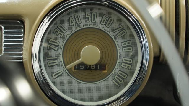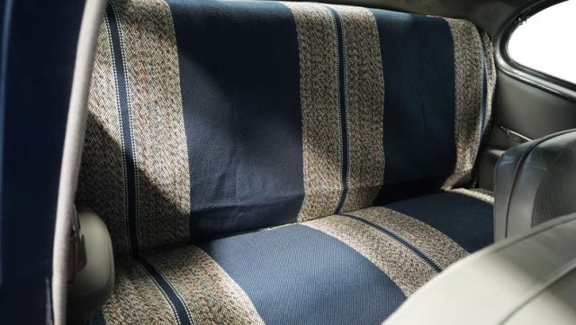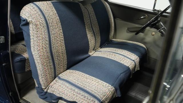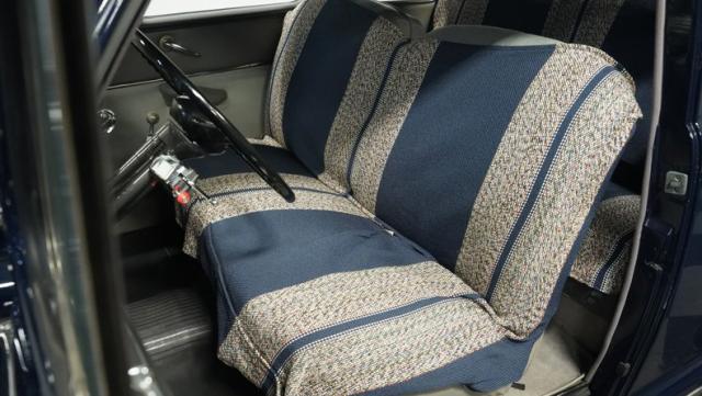 The gray cloth interior, complete with armrests in both doors and a horn ring, shows the Super Deluxe\'s premium status. The bench seat and headliner show well, while the carpet in the rear and rubber mat up front keep things tidy. The dash, clean and uncluttered, houses a Wonderbar AM radio ready to fill the cabin with nostalgic tunes.