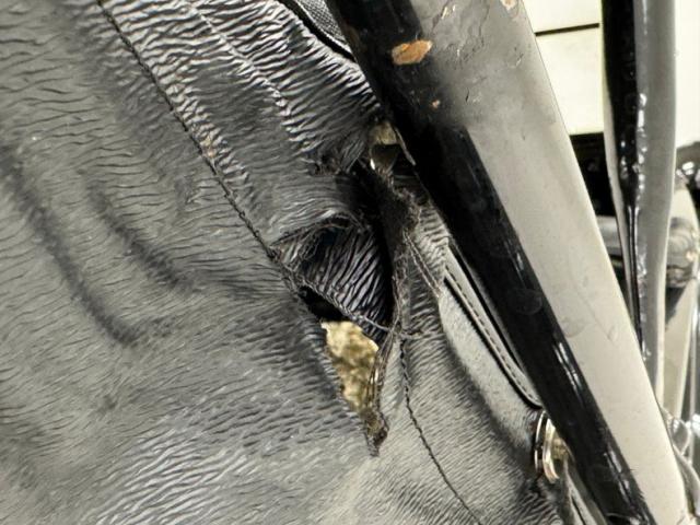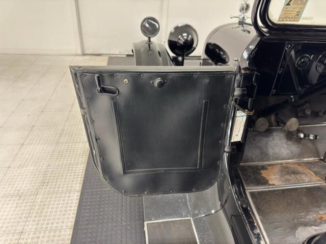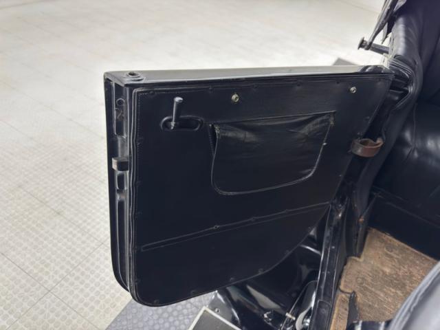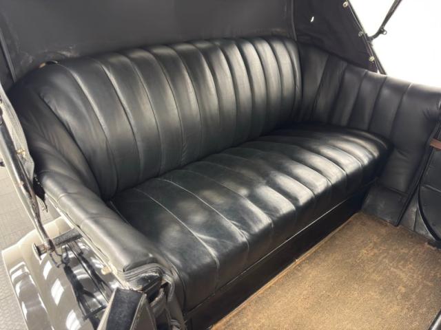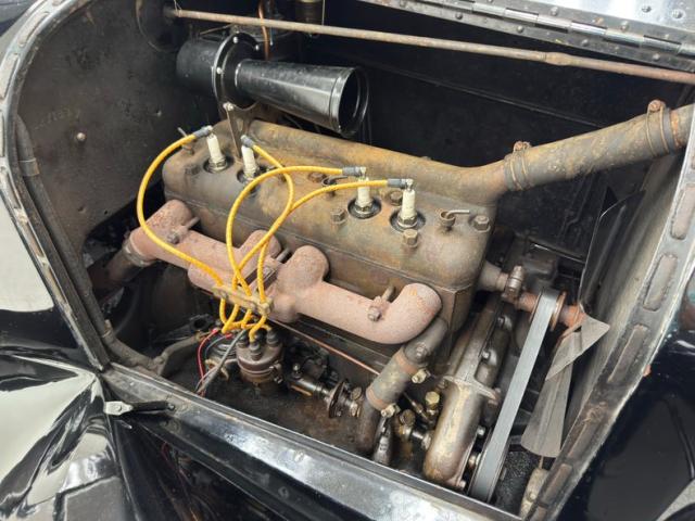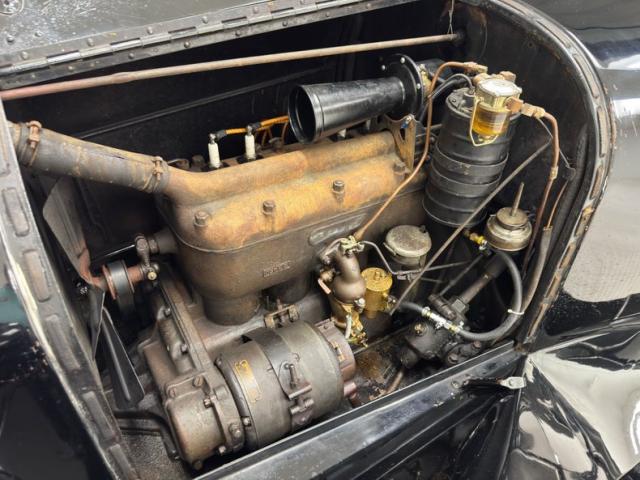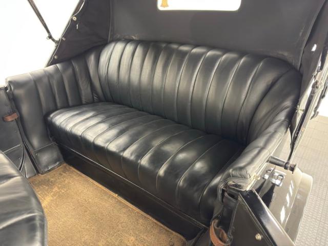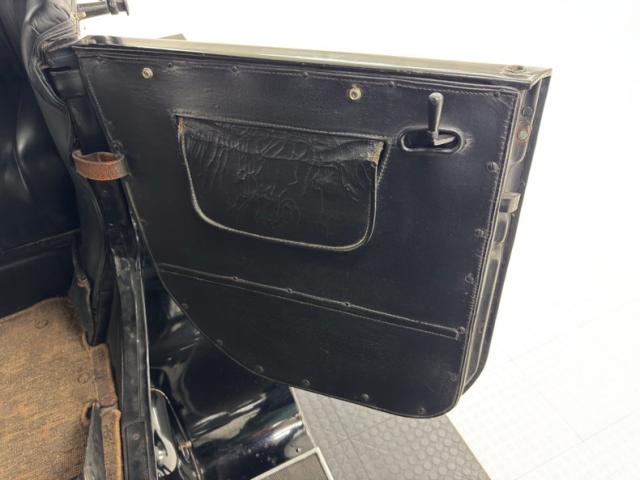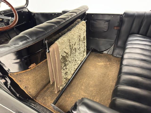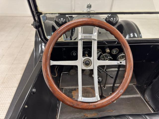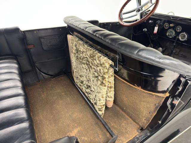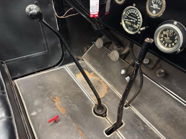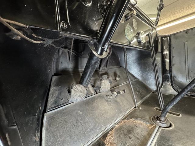 Plenty of patina on the door panels with cracking of the material but otherwise intact, the rear doors with storage pouch included. The channel tufted bench in front is in nice condition and the rear bench matches in condition and color, benefiting from a robe pole from which a blanket hangs. A Neville fat man steering wheel is up front representing a wildly unique design with a thicker wood rim, substantial H-shaped spoke configuration, and oiling port. According to the tag on the wheel, it was first trademarked in 1915. It heads up a simple dash with four vintage gauges over black paint. The vinyl coating on the floor is aged and peeling as you\'d expect, and is home to the tall shifter, handbrake, and round pedals.