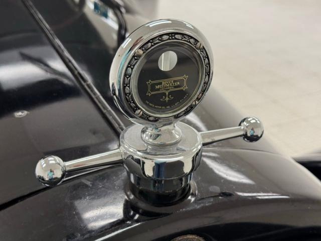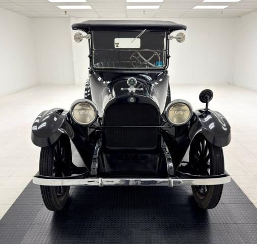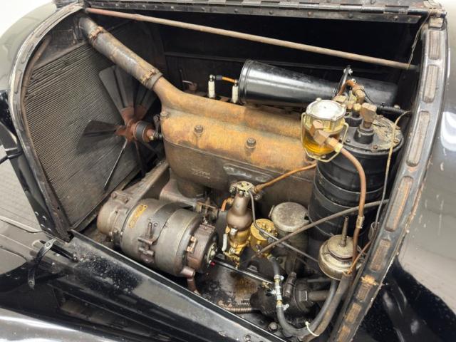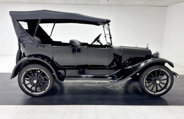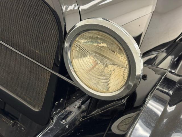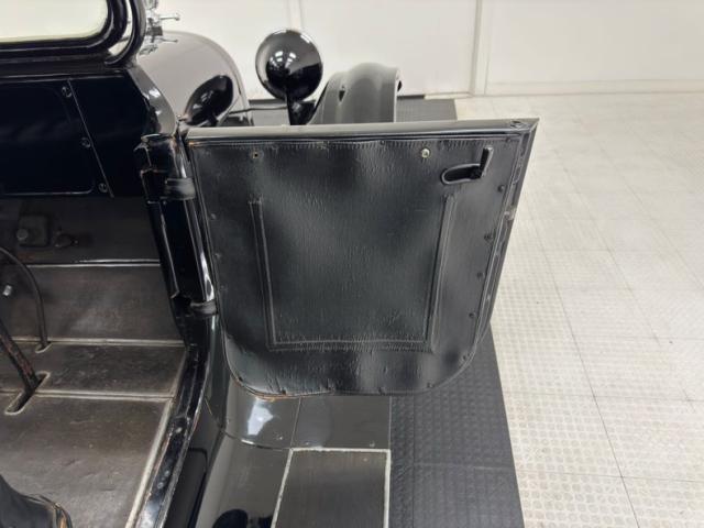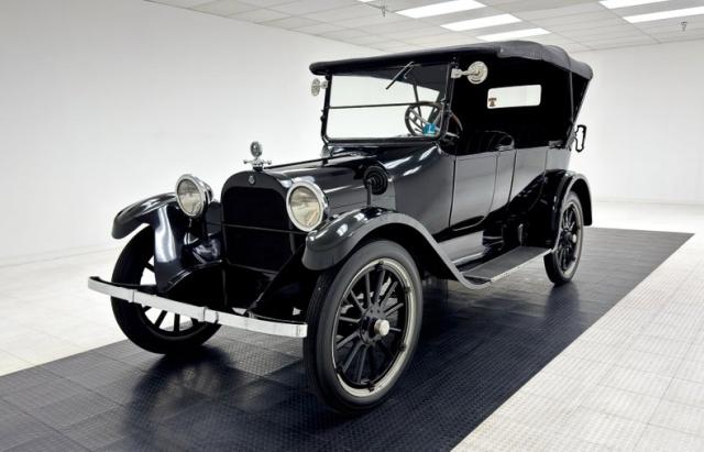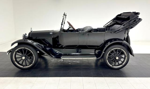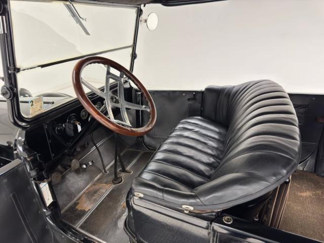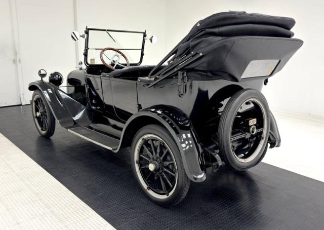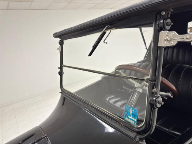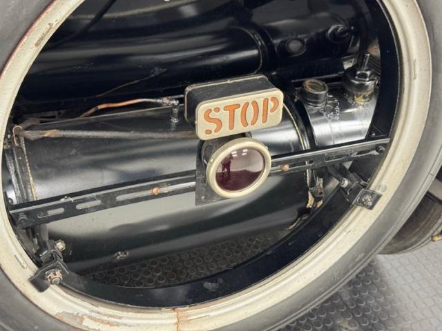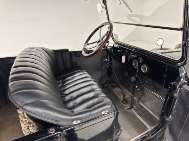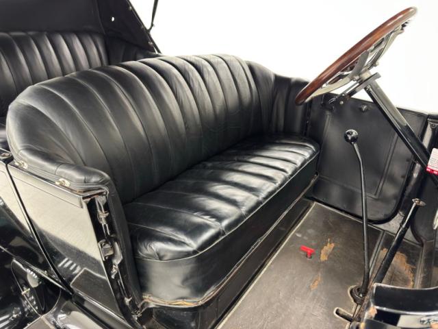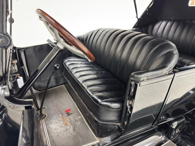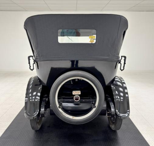 Move over GNX, over a hundred years ago black was the color of choice and this one presents in a monochromatic profile and included in the palette are the 32-inch wooden spoke wheels. A large and stately car by today\'s standards, she sits high and rides on 4\" tires to help navigate rough roads, or no roads at all. Like a poolside cabana, the black vinyl roof hovers over the cabin and maintains a glass window in back and like a horseless carriage, the whole unit can be folded rearward for fully open air driving. A stop light is mounted in the back, framed by a spare tire without a wheel while up front a chrome ribbon bumper mixes visually with the chrome headlight rings and the shiny motometer on top of the radiator. Imperfections include a tear in the soft top along with tears near the pivot points and some areas of rough and chipping paint.