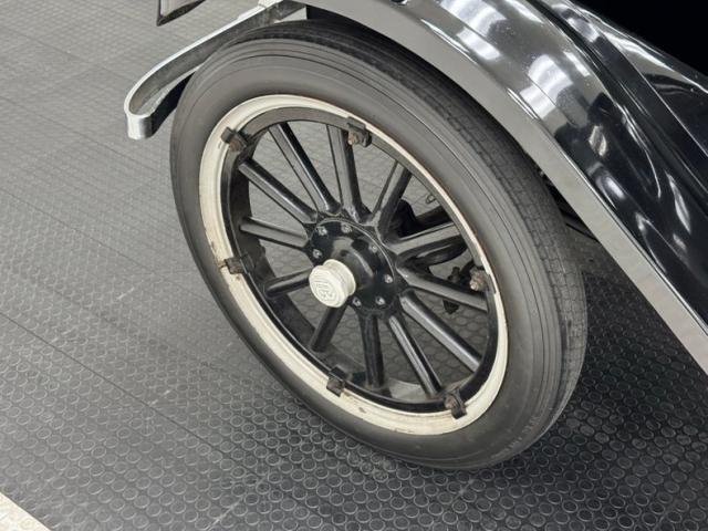 Uniformly black underneath including the wood plank flooring, all with some expected patina. There\'s oil on the bottom of the engine and the rear differential and some surface rust on the exhaust, but otherwise the underside is clean. That exhaust is a single unit that encounters a stock style muffler before exiting under the car. Suspension is still a vestige of horse drawn carriages with leaf springs occupying front and rear.