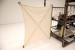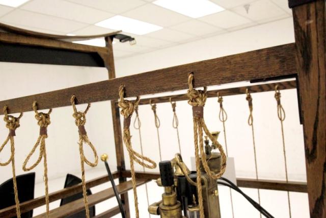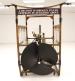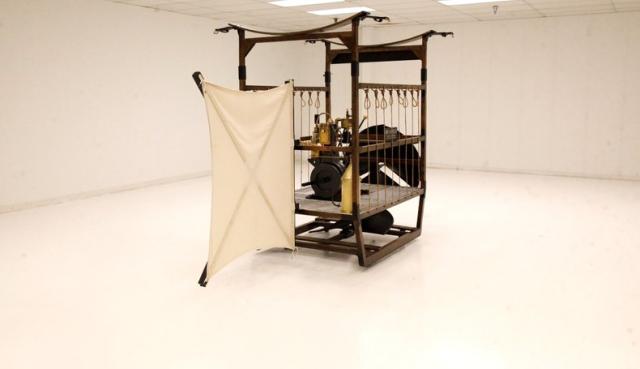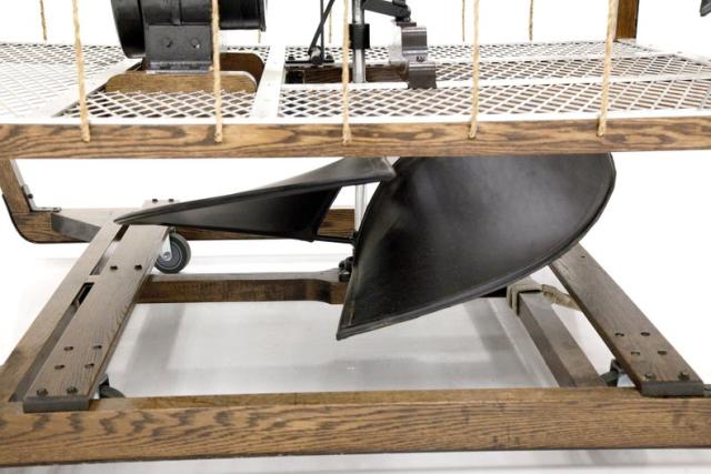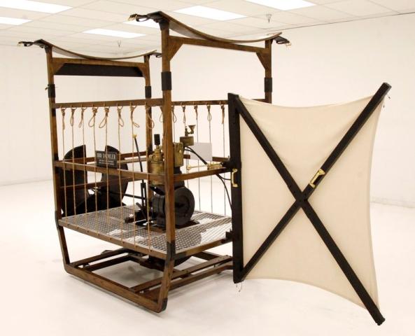 For consignment, a cockpit and gas power plant with dual propellers and a steering panel which is attached to the underside of a hydrogen filled zeppelin. This device could control the horizontal and vertical movements of the craft which has most of its lift from the zeppelin gas bag which was about 100 feet long mounted above. The pilot would sit in the back and use a stick to operate the device. Based on the side ropes which we can assume would hold droppable ballast, gave even more control.