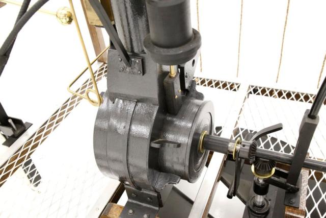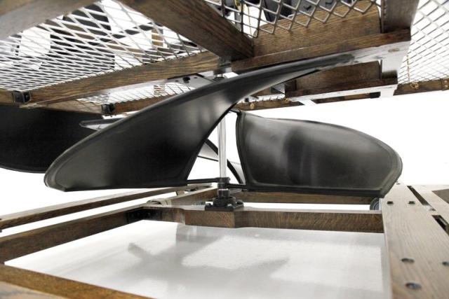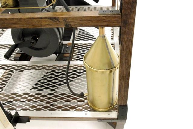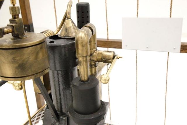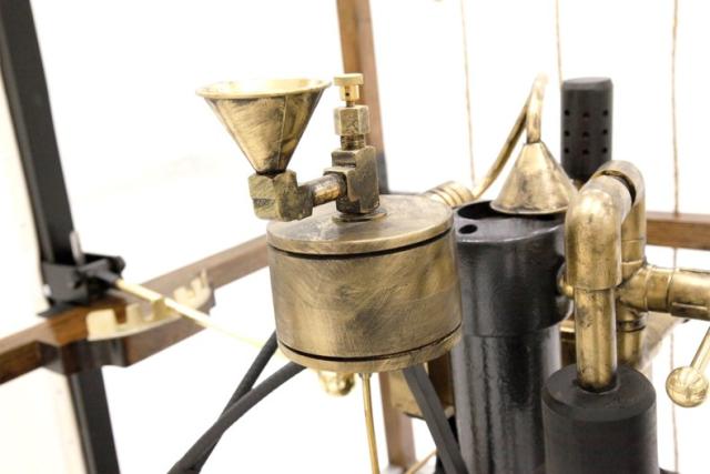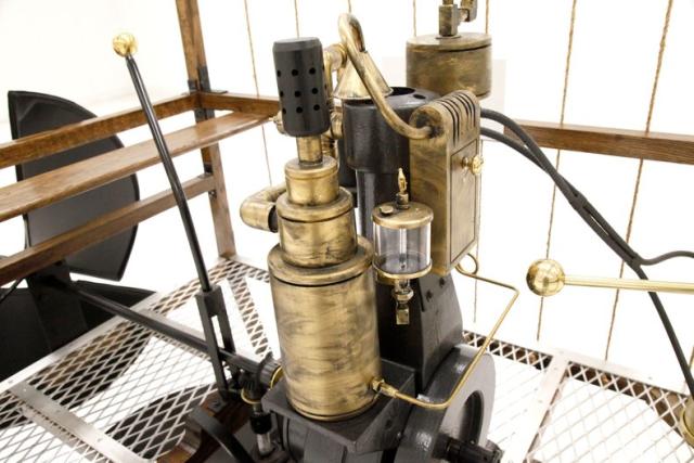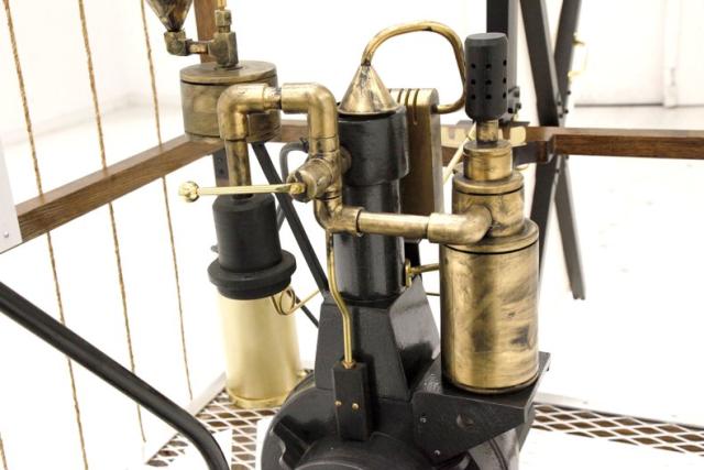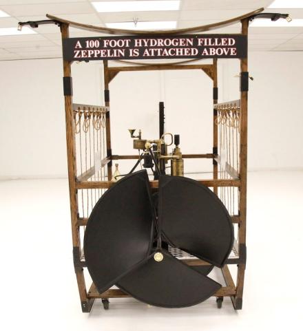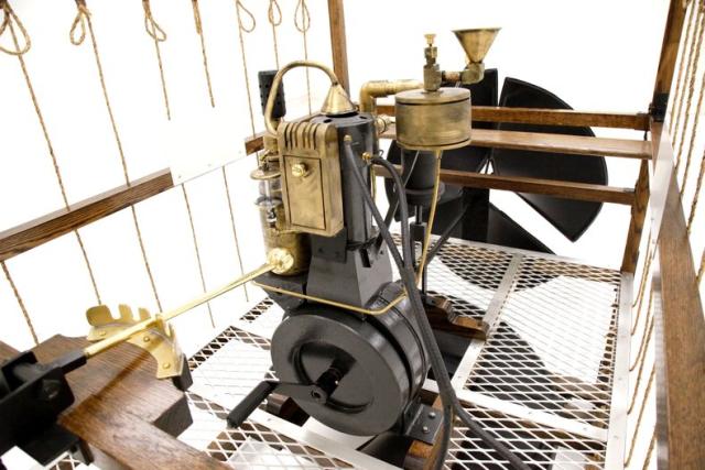 This recreation is the work of William Eggers of Goshen CT and one of many old interesting recreations to grace our Hallowed Halls. It is essentially a 150cc gas powered engine and produces 2 hp at 700 rpm. The propellers one on the bottom to control vertical movement, and the other on back controls the horizontal movement of the zeppelin. A large panel in front aids in steering the aircraft and acts as a rudder if you will.