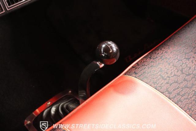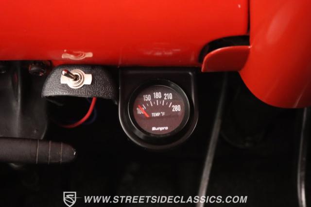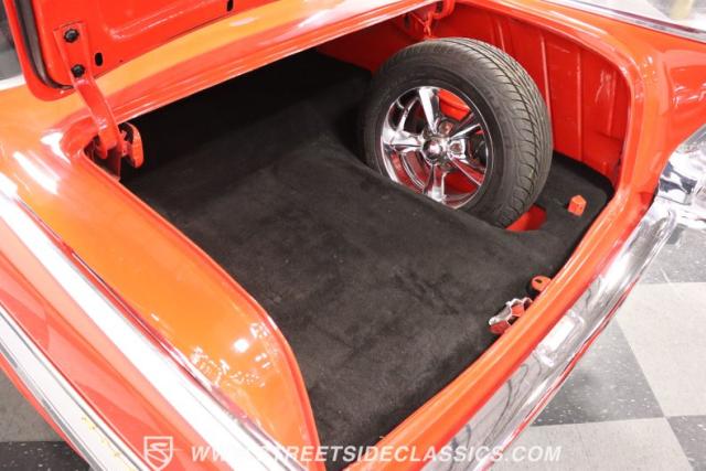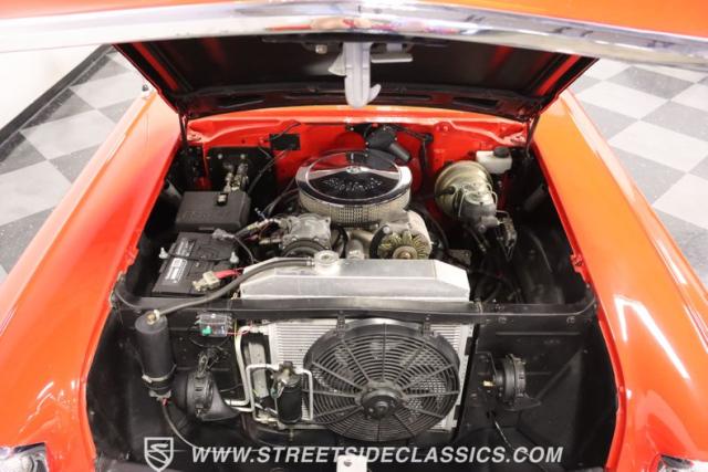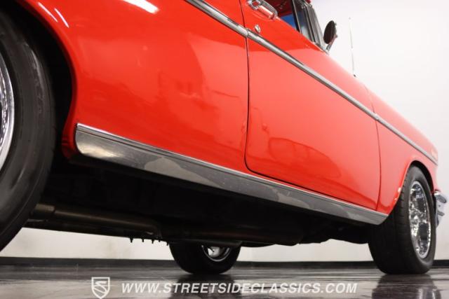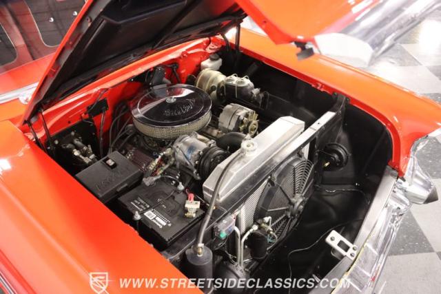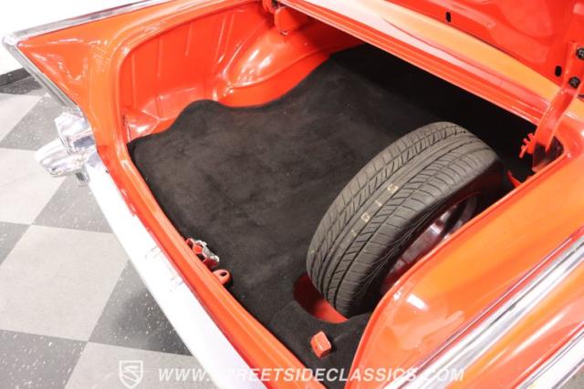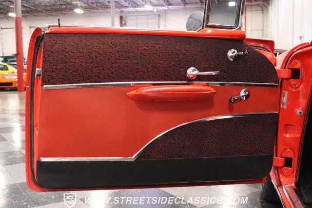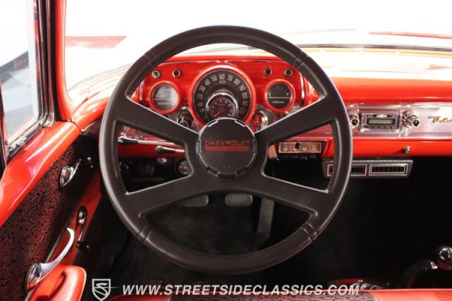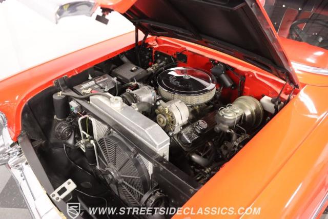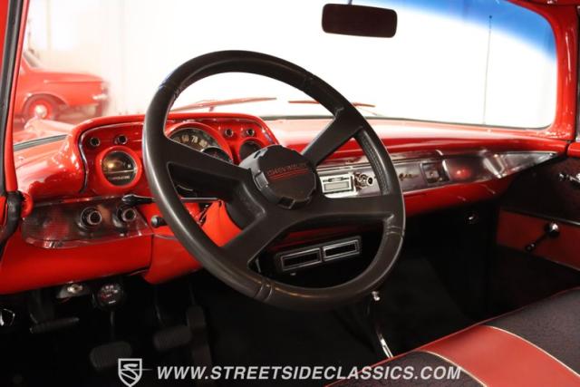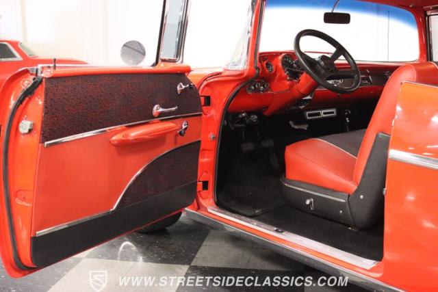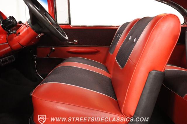 The red continues inside, and it\'s joined by black for an inviting two-tone. You can tell they took the time to get the vintage style right just by the upholstery. It\'s a fresher investment that\'s detailed with the classic textured fabric and button-top finish. The door panels are done to match, and it\'s all joined by quality coordinating pieces on the carpeting, dash, and headliner. It\'s the kind of impressive overall presentation that will have you leaving down all the windows on this pillarless hardtop just so classic car fans can get a better look inside. But this one also wants to be a more comfortable cruiser for modern times, and that\'s why you have upgrades like the custom Autosound AM/FM radio with iPod input, tinted windows, and provisions for air conditioning (the belt will need connecting and it will need servicing to blow cold again.) It\'s even an upgraded driver with a more modern Chevy steering wheel (a stock one also comes with the sale,) a tilt column, and added temp gauge. Plus, the addition of a Sunpro tach and a Hurst floor shifter really give this \'57 Chevy a fun sports car vibe.