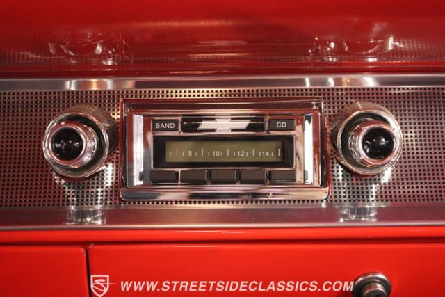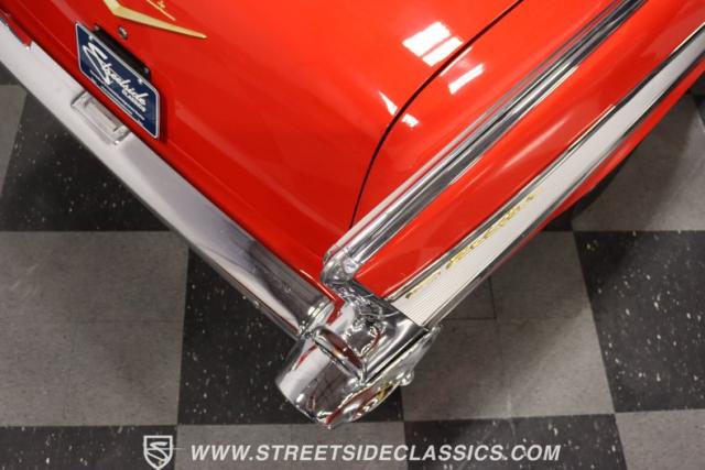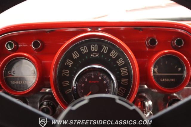 The red is a product of modern and professional application. We are told the restoration was completed around 2013, and the odometer tells you how far it has gone since completion. So it has been a carefully maintained classic that still has the freshness and vibrancy of a 1k mile build. The low mileage also means that acres of chrome and stainless have a mirror-like quality. This includes the wide grille, bumpers with Dagmars as large as the headlights, dual jet-inspired hood ornaments, and the full-length body trim that ends in the hallmark bright tailfin inserts. This Chevy also loves to show off its sporty side within the whine with the modern 17-inch polished alloys. It makes for the kind of total package where you just know you\'re going to catch people taking a long look at this one - no matter if it\'s at a car show or you just leave the garage open for the neighborhood to see.