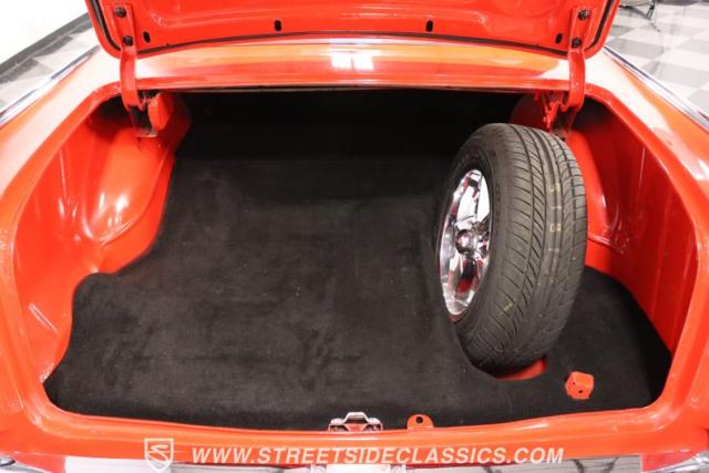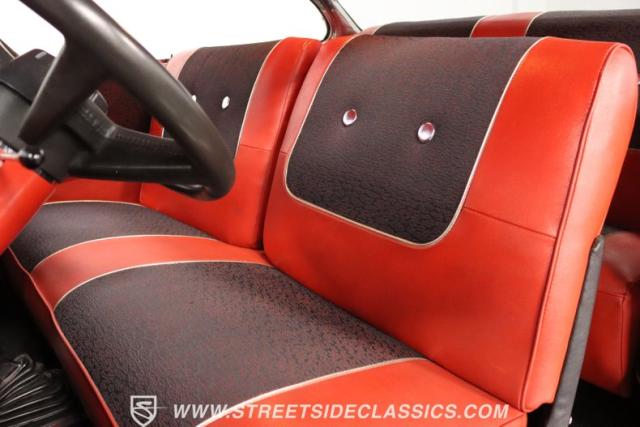 The engine bay loves to use the dark and slick inner walls to funnel your attention to the upgraded heart in the middle. The Tri-Five Chevys were the dawn of the small block, but they were never given anything like this. The 383 stroker V8 is a younger powerhouse from the masters at BluePrint. So it continues the small block legacy, but now in a big block level of displacement. It has the right go-fast goodies like an Edelbrock four-barrel carburetor, an aluminum intake, and ceramic-coated headers feeding the X-pipe dual exhaust. And the upgraded five-speed manual transmission means you get even better ratios the factory was offering to properly harness the extra powerful V8. Plus, features like power steering, power brakes, front discs, and an aluminum radiator with electric fan are there to keep this an easy cruiser.
