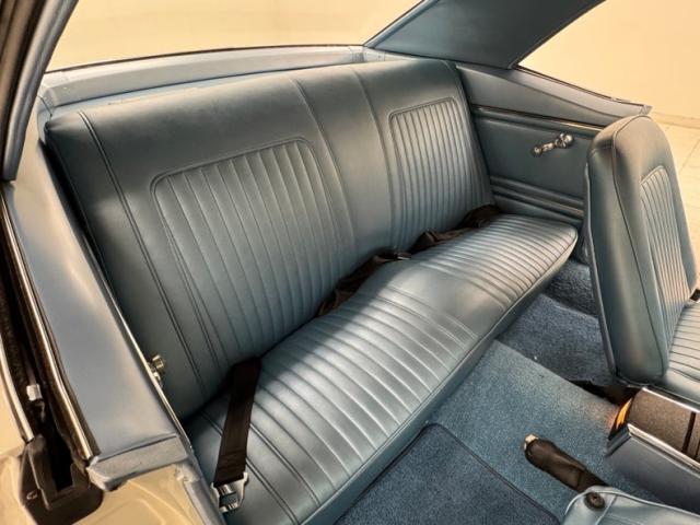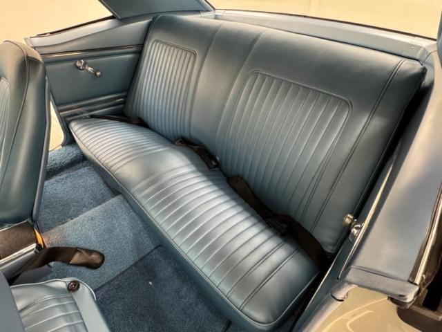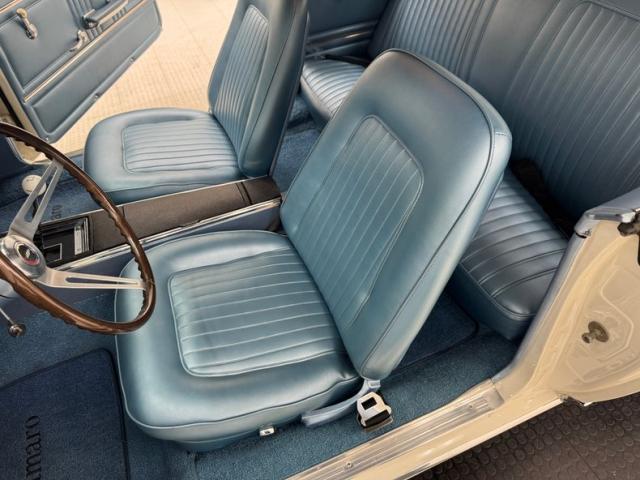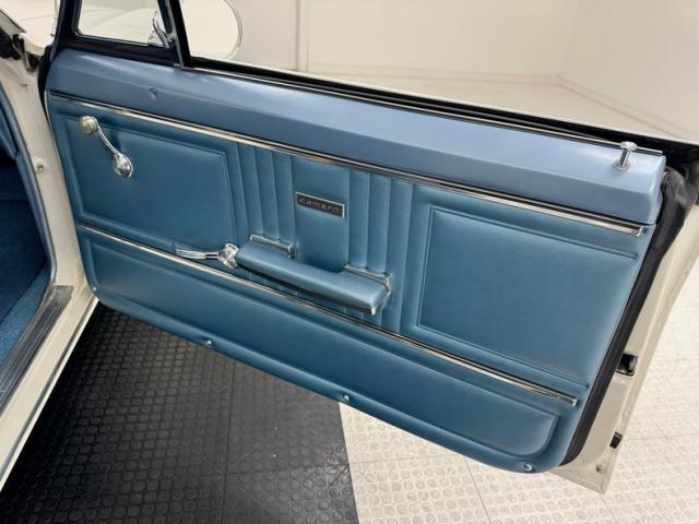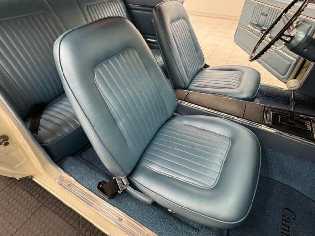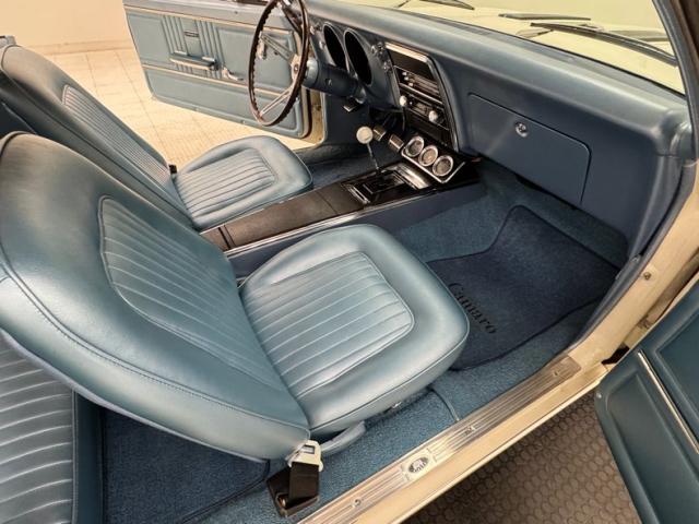 The cleanliness trend continues inside where blue stitched patterned door panels are dressed up with silver trim and bright hardware and both doors are impeccable. Blue vinyl bucket seats and the rear bench are all immaculate. Brushed aluminum finish on the steering wheel spokes are a great contrast to the brown frame that visually surrounds the dual gauges up front and smooth, blue dashboard with silver knobs while we note the absence of vents. The center stack does contain the vent lever panel however, along with an updated AM/FM radio and triple gauge pod. A gleaming shaft of the tall Hurst shifter grabs your eye just before you grab the white ball handle knob and the plastic base of the center console is some of the nicest we\'ve seen, right out of the Chevrolet catalog. Black twist carpet below, Camaro branded carpeted mats, a high and tight headliner, and a clean and barren trunk with plaid mat round out this show car\'s interior quality. We may not be as picky as our consignor who notes some discoloration on the driver\'s side carpet!