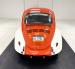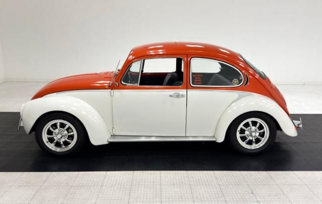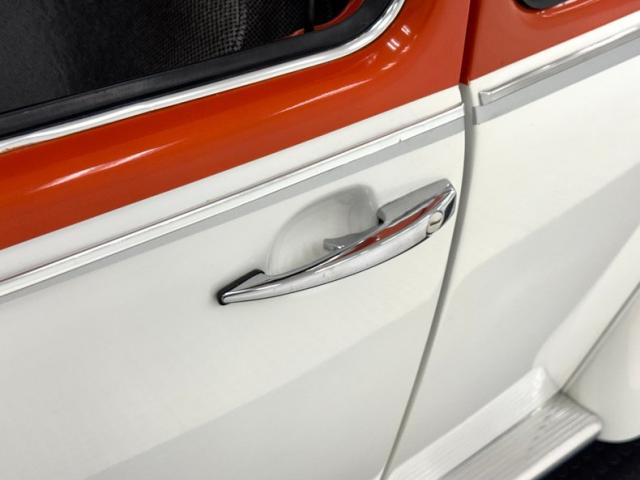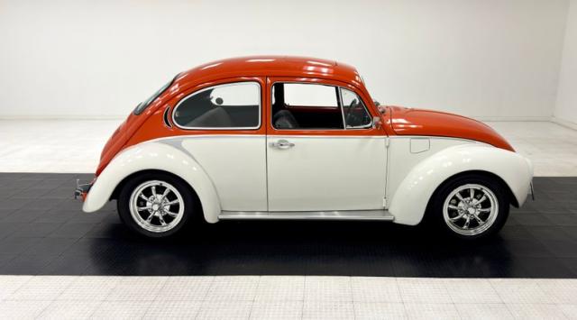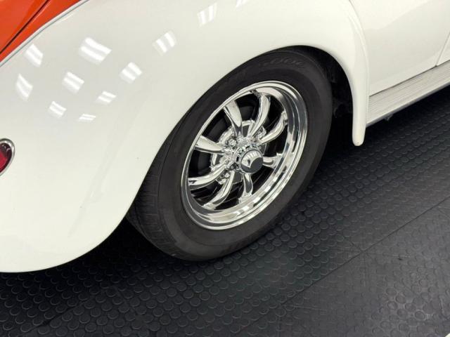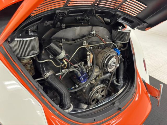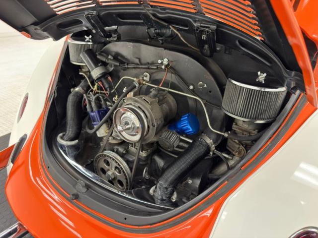 Orange and White two stage paint alternate on the body creating a dramatic presentation with a bold orange center and white flanks. The bumperless front features LED headlights and body colored rings and shaved fender markers replaced with stealthy LED\'s down below. Out back, Frenched teardrop tail lights create a custom look with marker lights now affixed to the free floating bumper braces that flank twin exhaust pipes. A gray graphic highlights the shape of the car by riding the shoulder line and widening at the rear fender while the black has been removed from the running board creating sleek, metal units. 15-inch chrome Minilite type wheels carry staggered size tires no older than 2019, and the bug has been lowered 2\" over them for a classic street stance. A single crack in the paint near a running board is the only exterior imperfection we note.