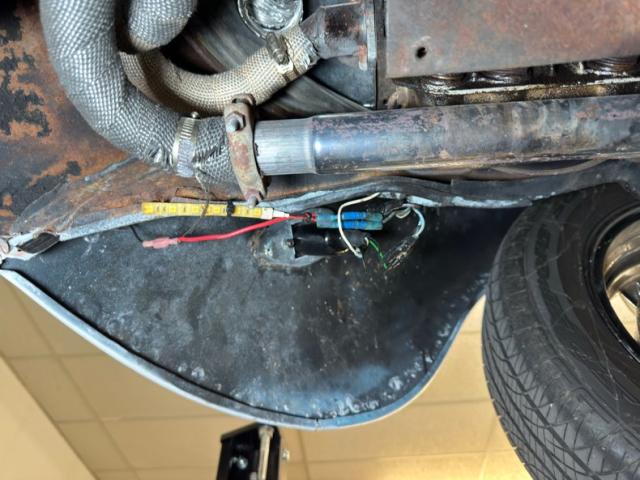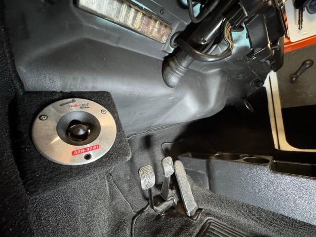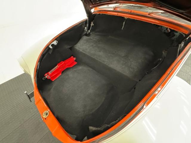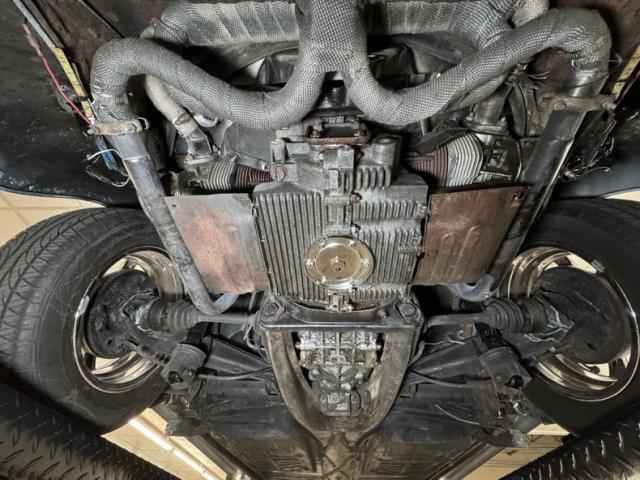 Generally clean underneath with typical surface rust, patina, and a clean, prominent belly pan. We note some gunk build up on the transaxle and some cut out and patched metal. Dual exhausts are heat wrapped and flow through a stock style muffler that emits two chrome tailpipes. Brakes are onboard as front disc and rear drum and the lowered suspension included MacPherson struts up front and a transverse torsion bar in back with semi trailing arms.