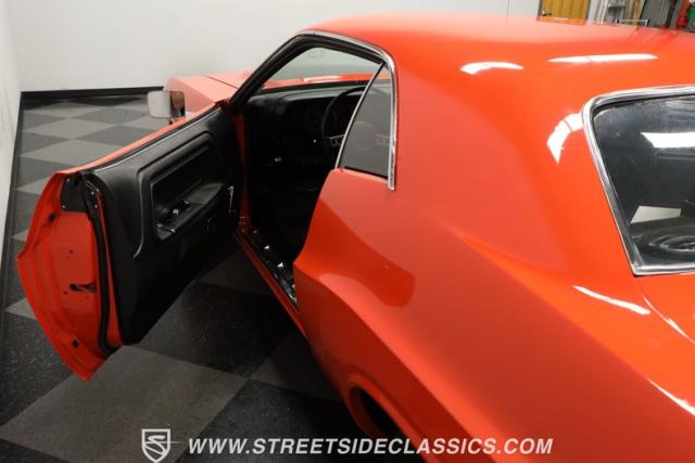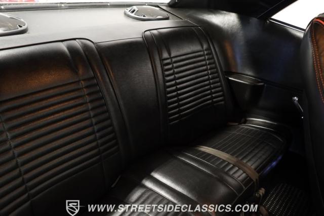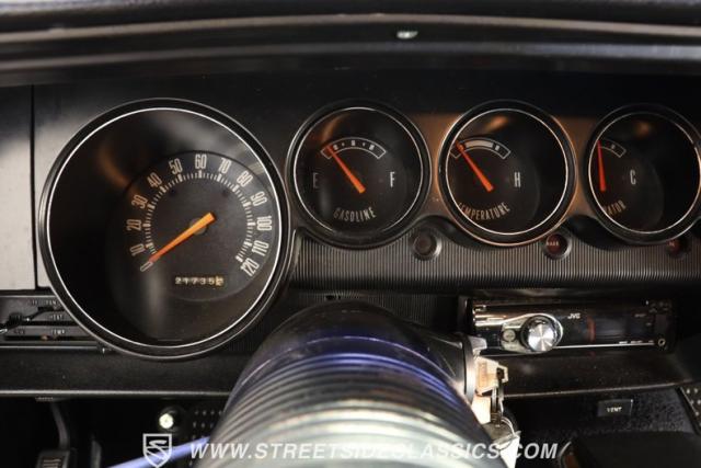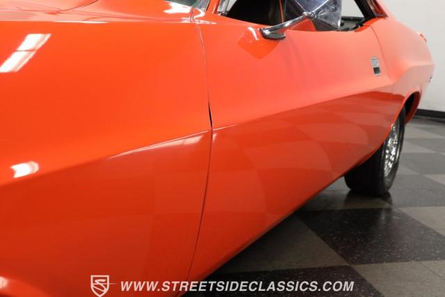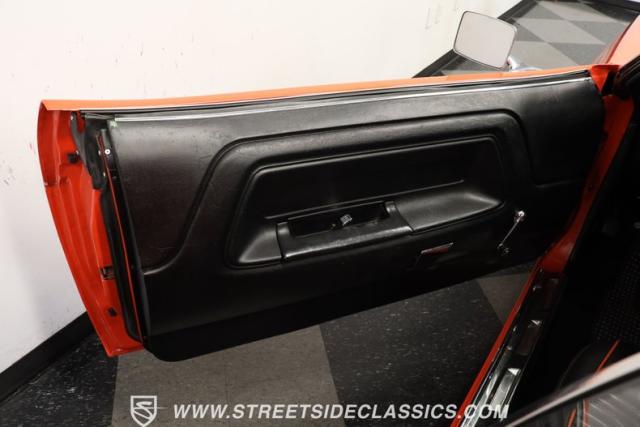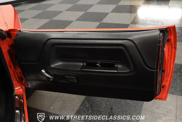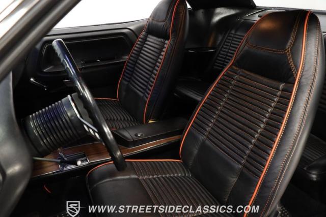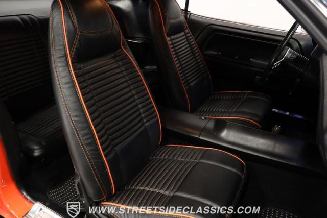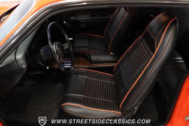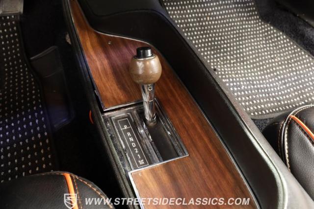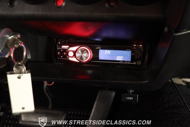 Inside, the black vinyl upholstery features a pair of front bucket seats that have been upgraded with contrasting orange stitching that ties in well with the car\'s overall color scheme. The seats straddle a clean center console with wood trim, and the dash pad spanning the width of the cabin still has its deep black color, with no visible warping. You\'ll find a collection of factory gauges still in place inside the instrument cluster, still displaying their readings through clear lenses. Just below, a JVC AM/FM stereo with an auxiliary port has been added to the mix, combining with a pair of deck-mounted speakers to create a strong audio experience.