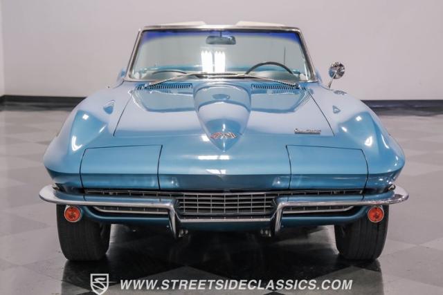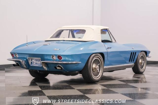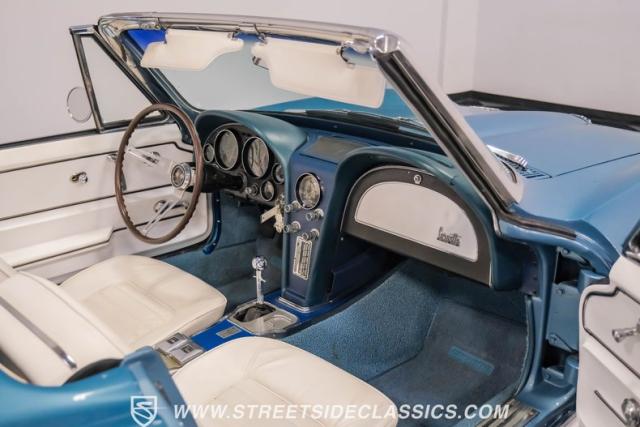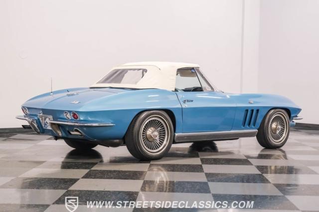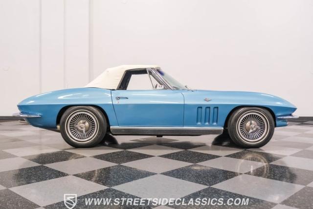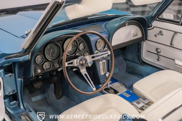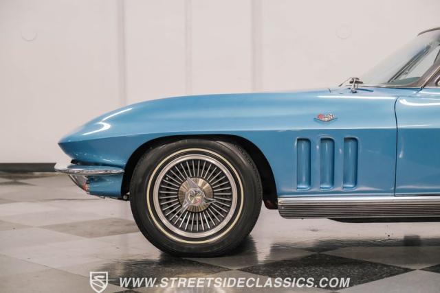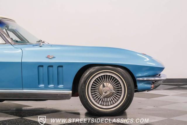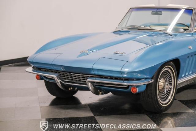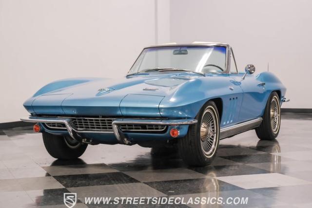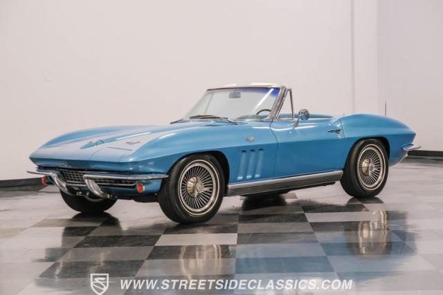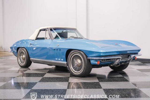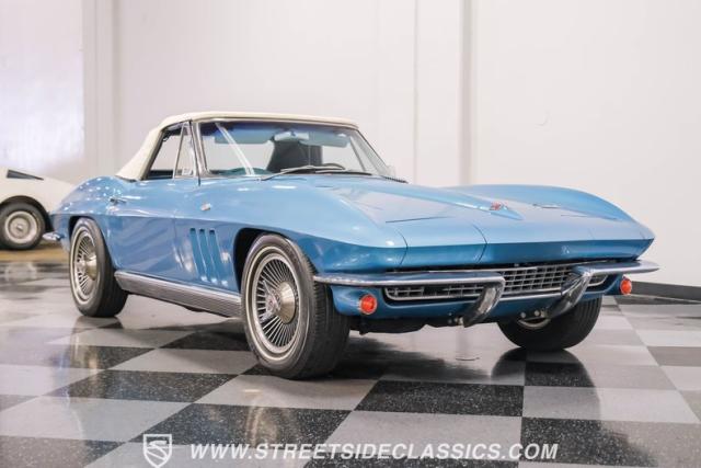 This 1966 Chevrolet Corvette Convertible sports a sleek factory correct Nassau Blue exterior. The C2 generation\'s iconic profile features a long hood, sculpted fenders, and a short rear deck. A white convertible top adds a classic touch, while 15-inch knock off wheels wrapped in 215/70R15 Michelin tires fill out the wheel wells.