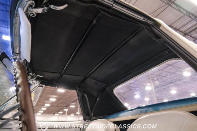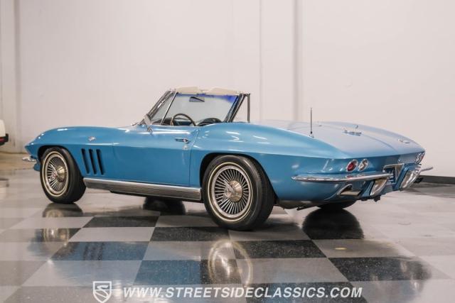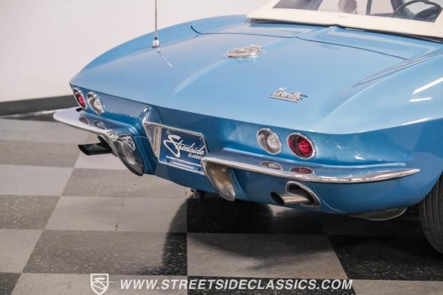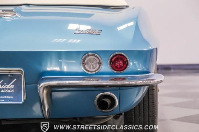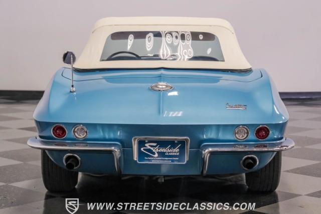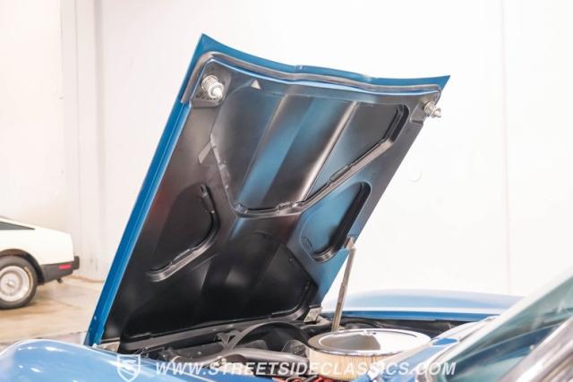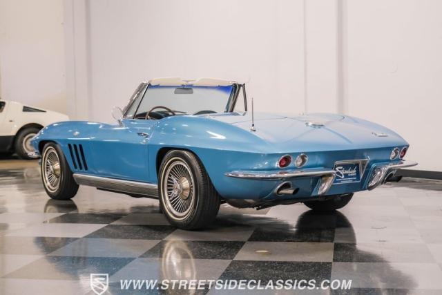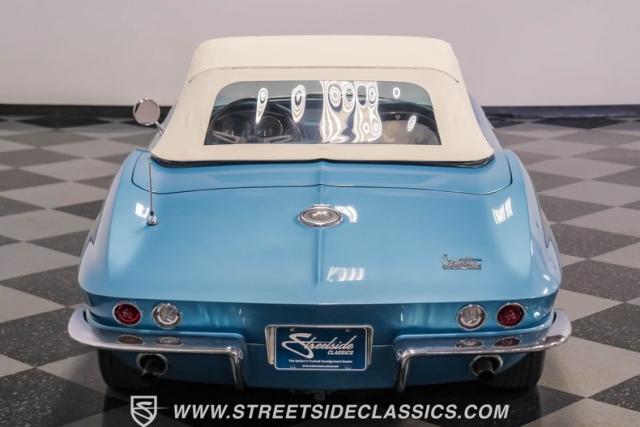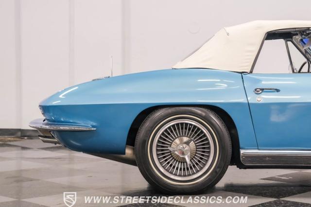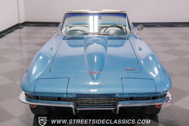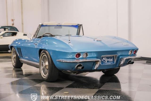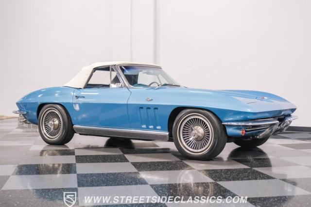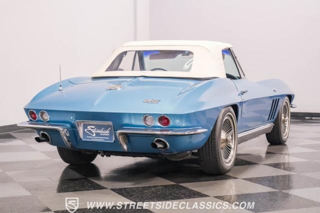 This 1966 Chevrolet Corvette Convertible sports a sleek factory correct Nassau Blue exterior. The C2 generation\'s iconic profile features a long hood, sculpted fenders, and a short rear deck. A white convertible top adds a classic touch, while 15-inch knock off wheels wrapped in 215/70R15 Michelin tires fill out the wheel wells.