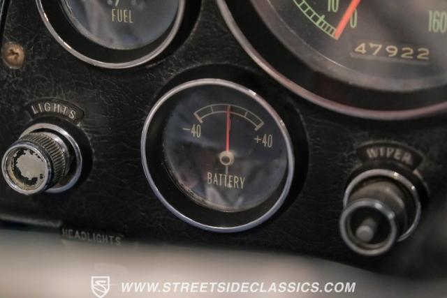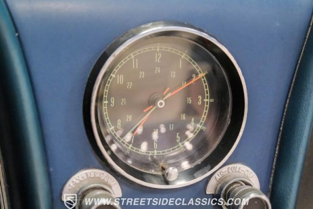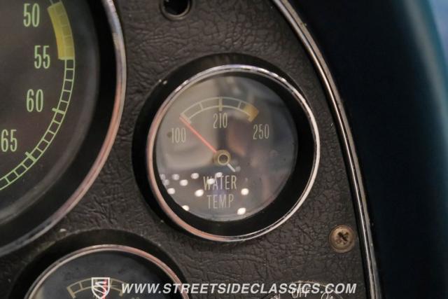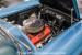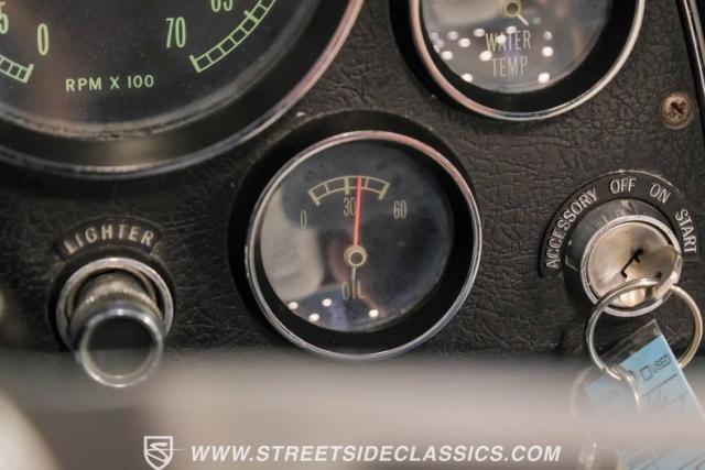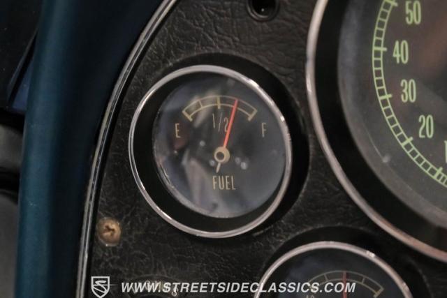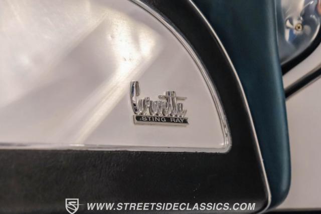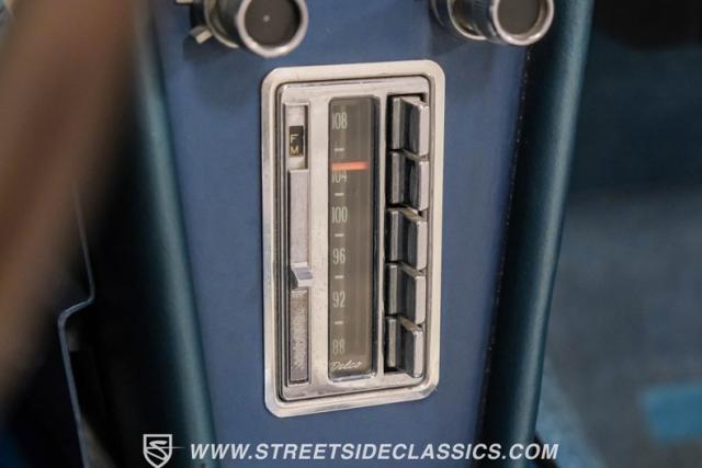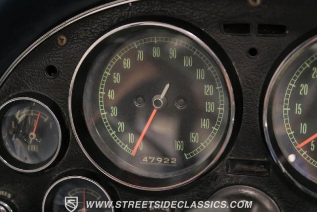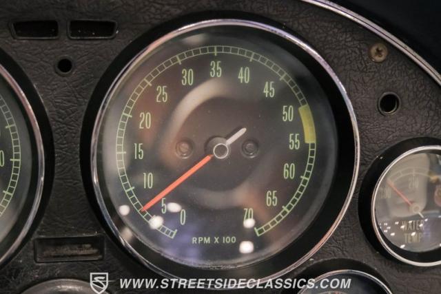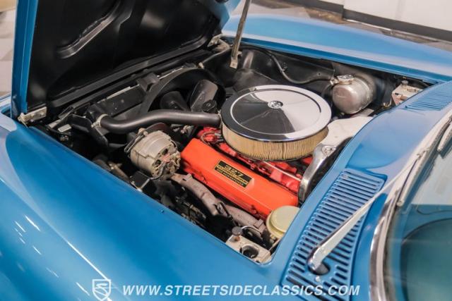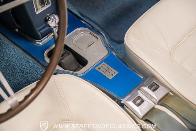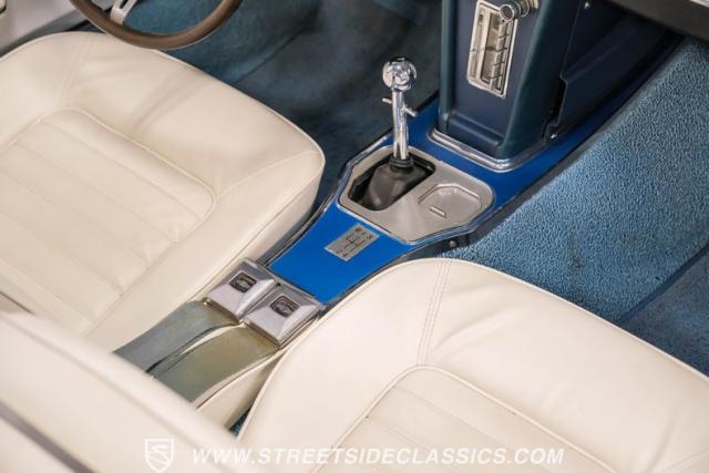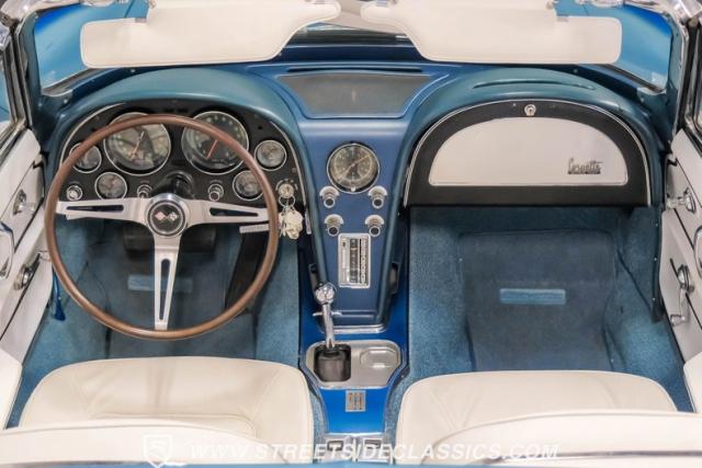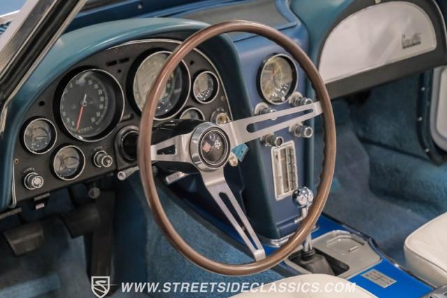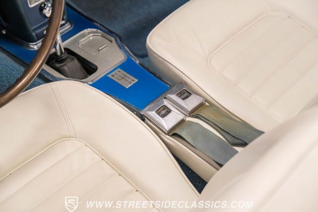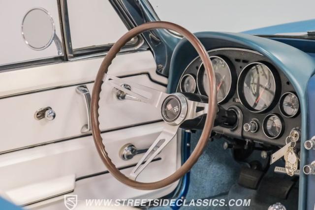 Inside, correct code 450 white vinyl bucket seats with blue accents define the cockpit. The teakwood-style steering wheel and floor-mounted shifter for the 4-speed manual transmission are period-correct focal points. A factory AM/FM radio sits in the dash, complemented by a center console. Original touches like the analog clock and chrome accents throughout maintain the Corvette\'s authentic 1960s ambiance.