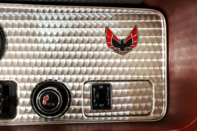 EXTERIOR: Mostly original paint! The correct Mayan Red color still sparkles under our showroom lights. All the panels are nicely aligned flush and square with good consistent caps that are spot on. It\'s satisfying looking down the side of the nice straight body. The long heavy doors do not sag when opened and close easily with minimal effort. The rear spoiler and Shaker scoop really enhance the overall profile. The wheel well flares and side scoops not only look tough but are functional too. It does the original and optional screaming chicken on the hood. All the glass is nice and clear. The molded fiberglass front fascia is not warped or cracked. It\'s rolling on a very correct and attractive set of 15x8 silver snowflake wheels wrapped in beefy Cooper Cobra Radial G/T tires. And the best part is it doesn\'t have any pesky t-tops to mess with, which is my personal preference because then they will never leak.