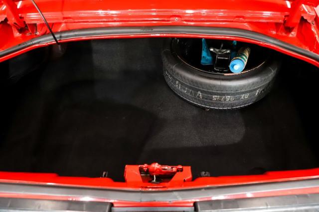 TRUNK COMPARTMENT: The underside of the trunk lid and inside the jamb both have original looking Mayan Red paint that is in great shape and still has the jack stickers too. I believe the weather strip was replaced at some point. The inside is nicely carpeted and it\'s complete with a full jack assembly, space saver spare tire, and original inflation canister. Under the carpet is nice clean metal with original looking satin black paint. The trunk light is working also.