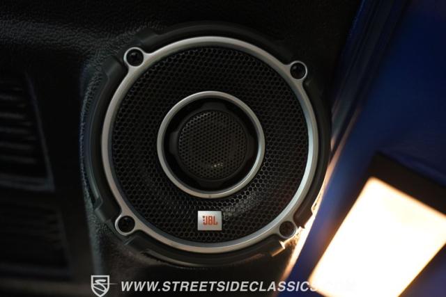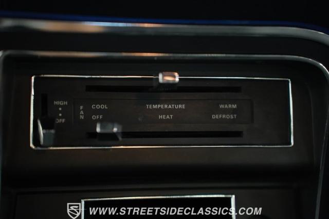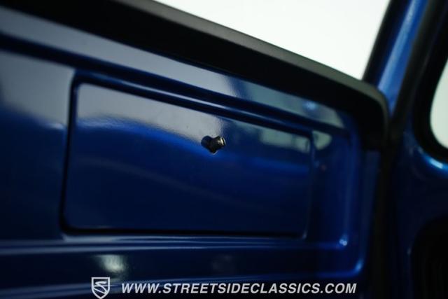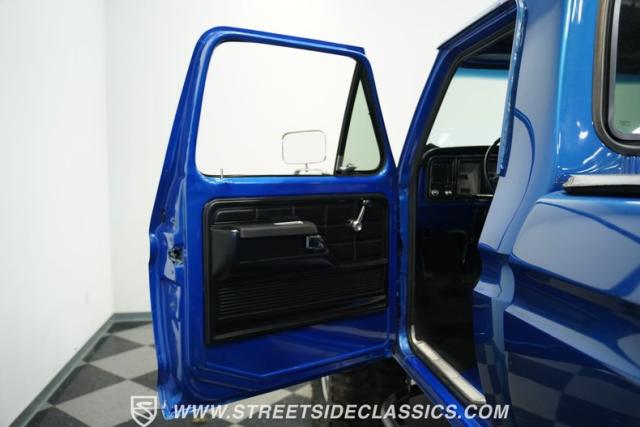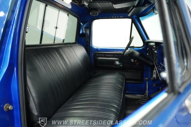 The interior of this F-150 has undergone a full replacement, restoring it back to a very clean and mostly original condition with mild upgrades. It features an OEM-style vinyl interior that balances classic looks with comfort, complemented by an aftermarket stereo system and JBL speakers housed in an overhead console for enhanced audio enjoyment. The cabin maintains a straightforward, functional design that stays true to the truck\'s heritage while offering a comfortable driving environment.