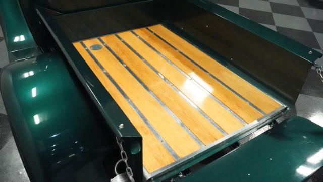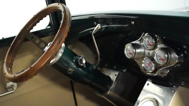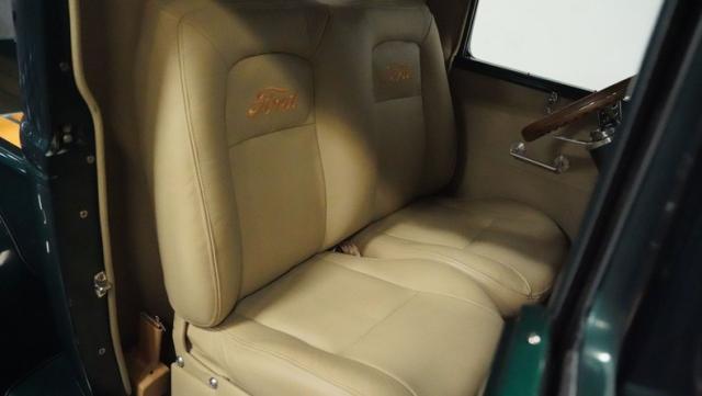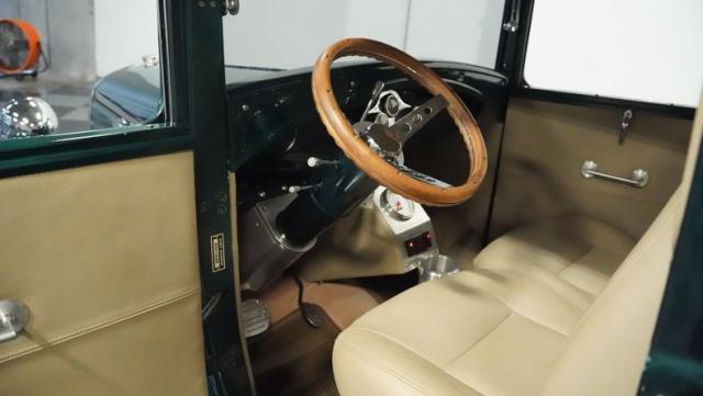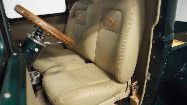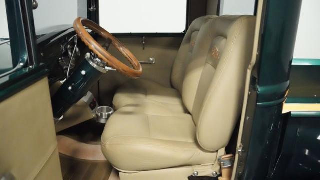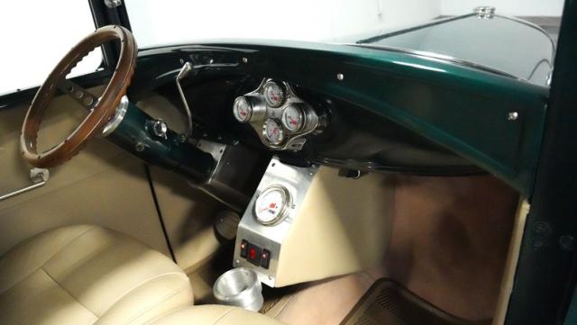 The cream leather interior showcases expert craftsmanship with green accents throughout. A split-bench seat anchors the cabin, while custom-matched door panels and headliner create a unified design. The dashboard retains the original gauge cluster location, now updated with modern instrumentation. A center console houses window controls, cup holders, and the speedometer, while the tilt steering column adds adjustability.