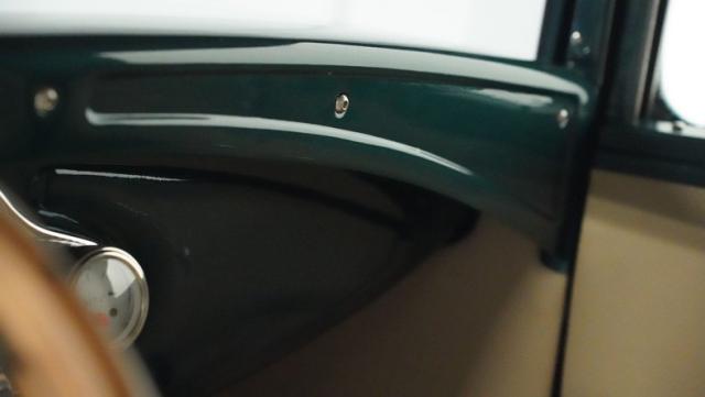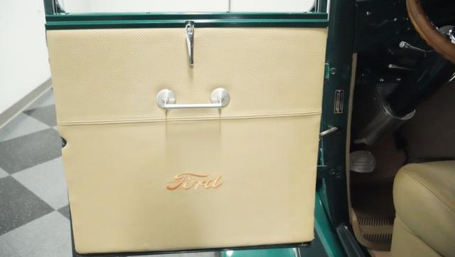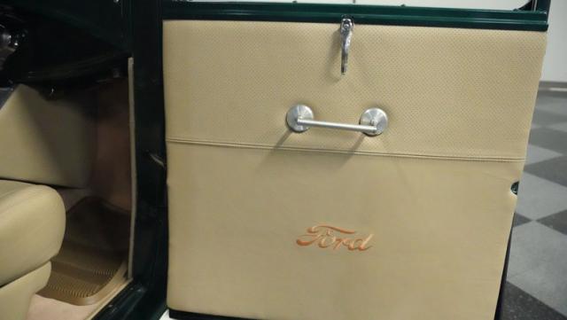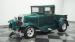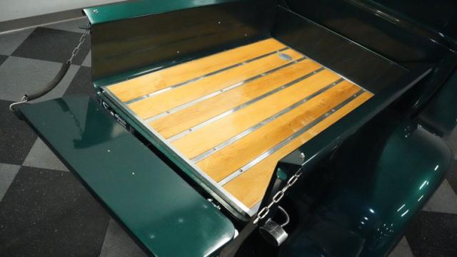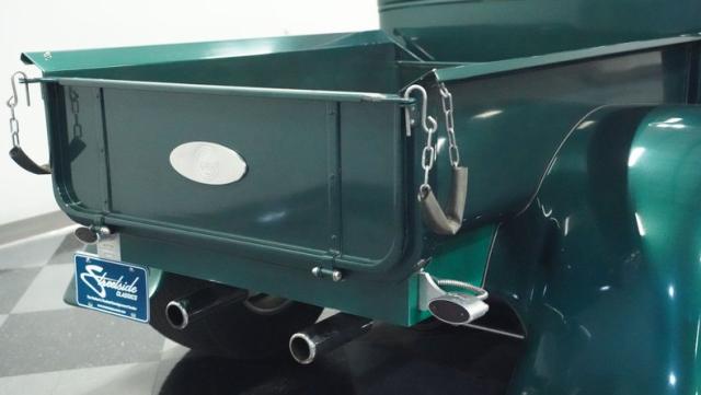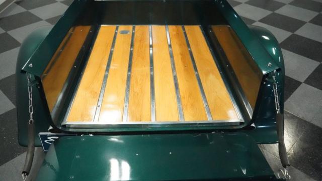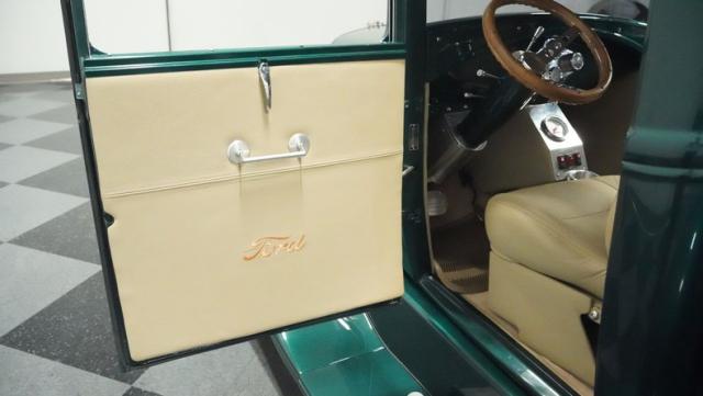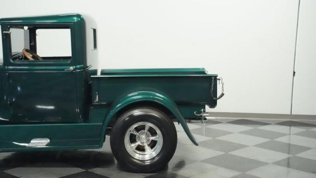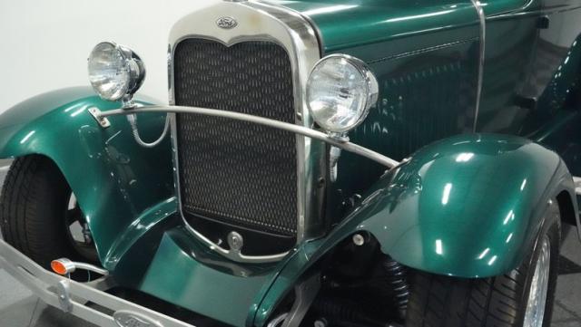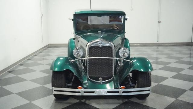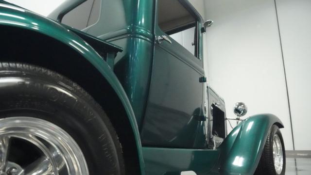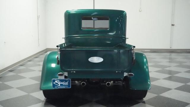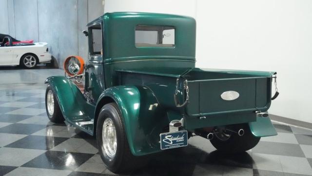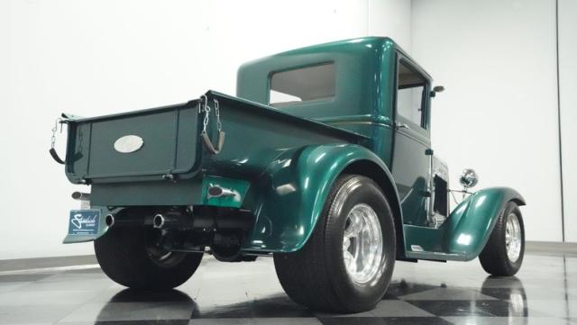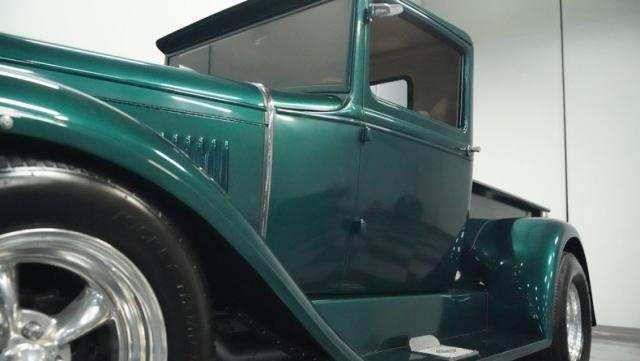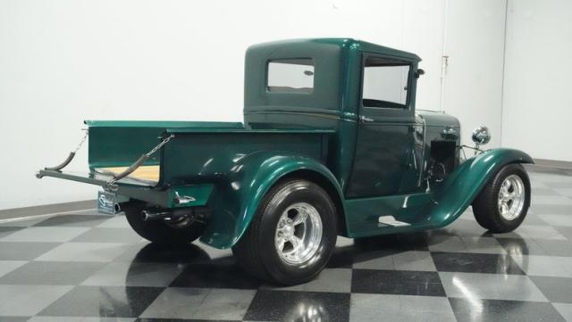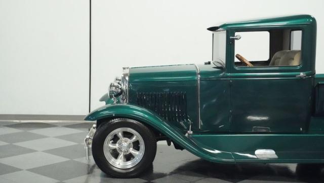 This 1931 Ford Model A Pickup represents the final year of Model A production, featuring a distinctive teal green metallic finish that adds modern flair to classic proportions. The expertly crafted fiberglass fenders widen dramatically at the rear, accommodating massive 29x15.5R15LT Mickey Thompson tires mounted on 15.5-inch Torque Thrust wheels. Up front, 235/60R15 rubber provides precise steering control. The aluminum accents, including mirrors, front bumper, and tailgate emblem, create a cohesive design theme. The wood bed maintains its utilitarian appeal while the crank-out windshield preserves authentic functionality.