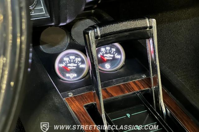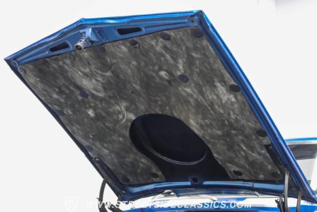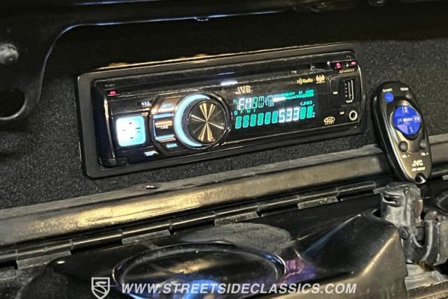 The clean black interior is in great condition and is largely stock in appearance. Greeting the driver is a factory-style woodgrain steering wheel, stock gauges and AM radio. The upgraded AutoMeter oil pressure and water temperature gauges are mounted on the console just beyond the factory horseshoe shifter. A JVC AM/FM/CD/AUX radio is hidden in the glovebox and is ready to play your favorite cruising tunes.