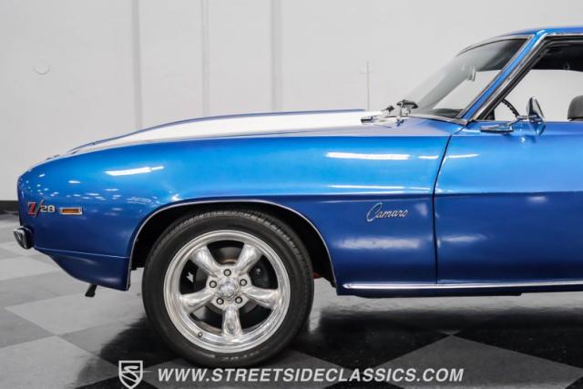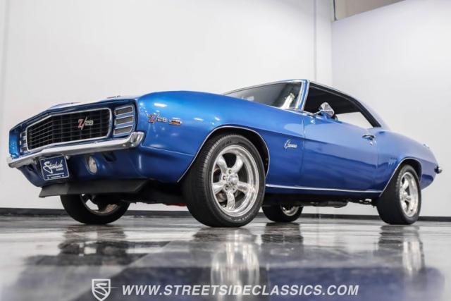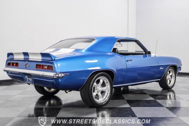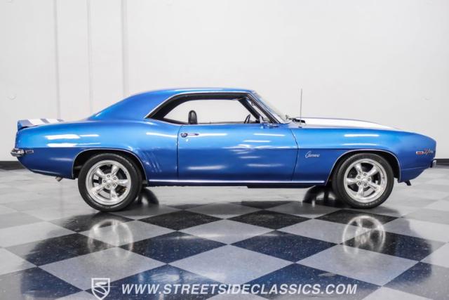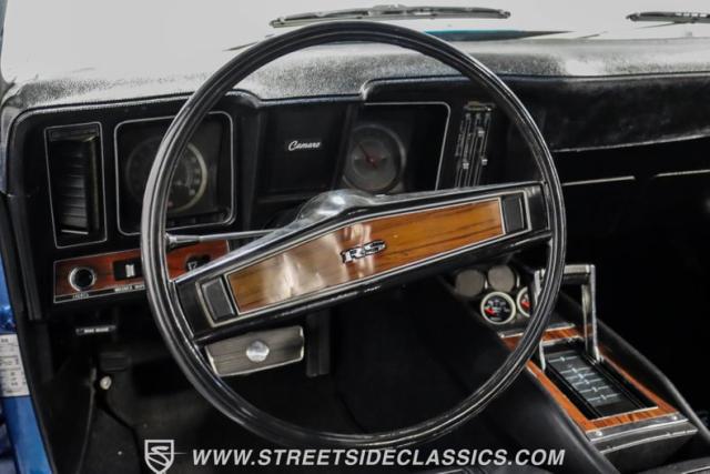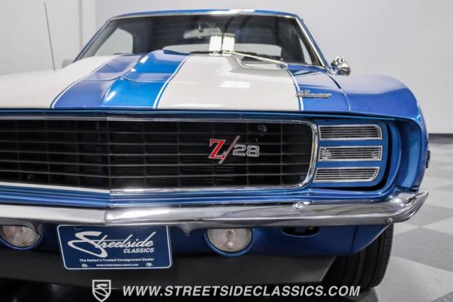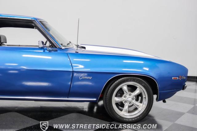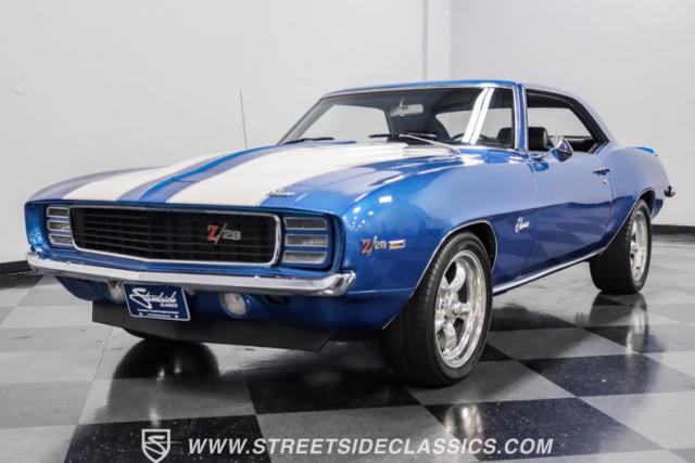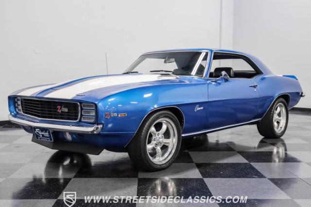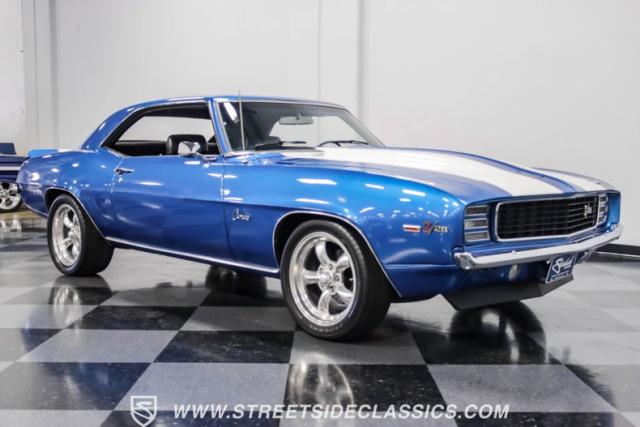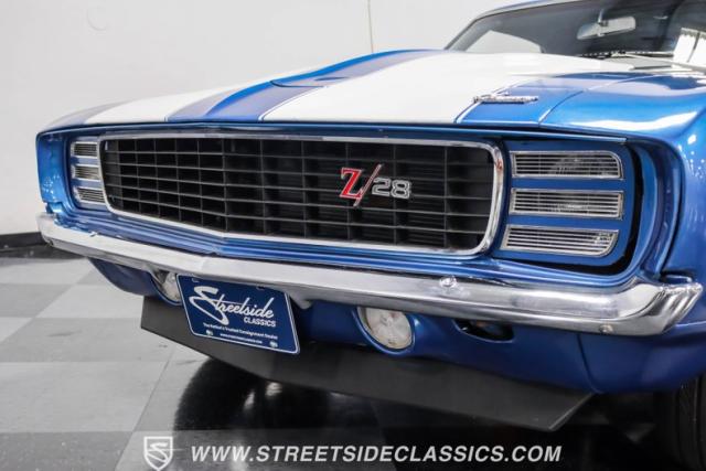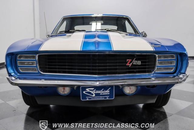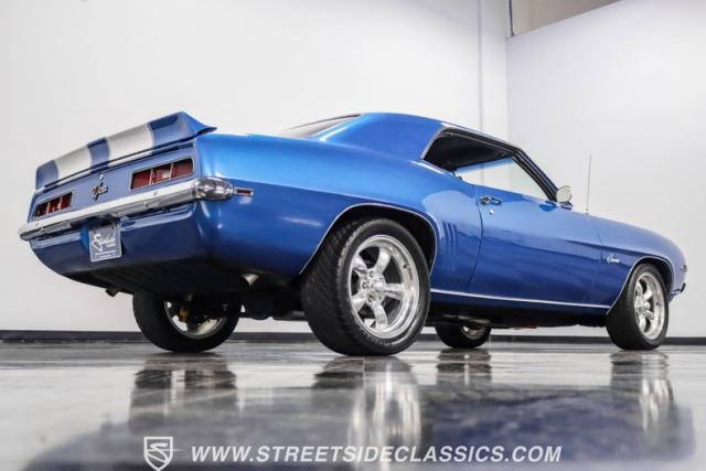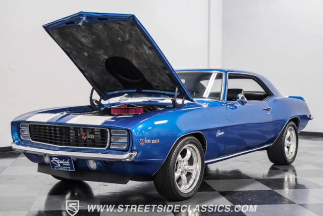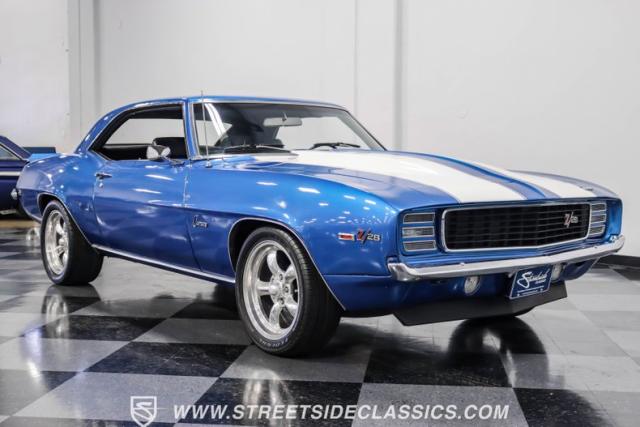 This restored classic 1969 Camaro Z/28 RS Tribute is finished beautifully in LeMans Blue with white rally stripes. The distinctive Rally Sport front end with concealed headlights and electric doors remarkably improves the great design of the Camaro. Additionally, a cowl hood, rear spoiler and chin spoiler make this classic even more desirable. A set of 17-inch polished torque thrust wheels wrapped with performance tires staggered 235/45ZR17 front and 275/40ZR17 in the rear complete the muscle car stance of this Camaro.