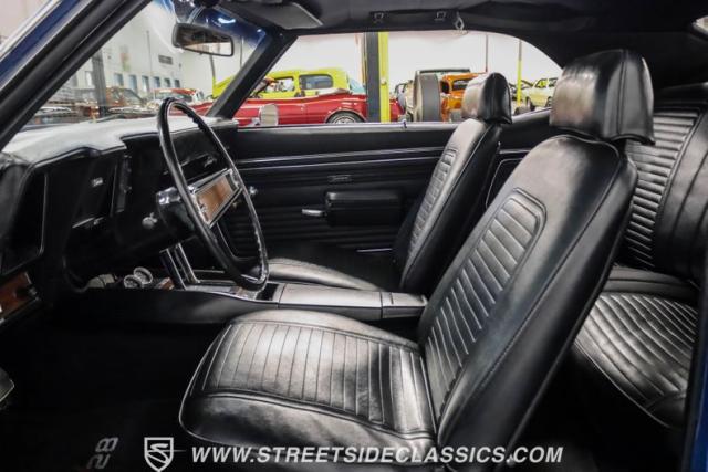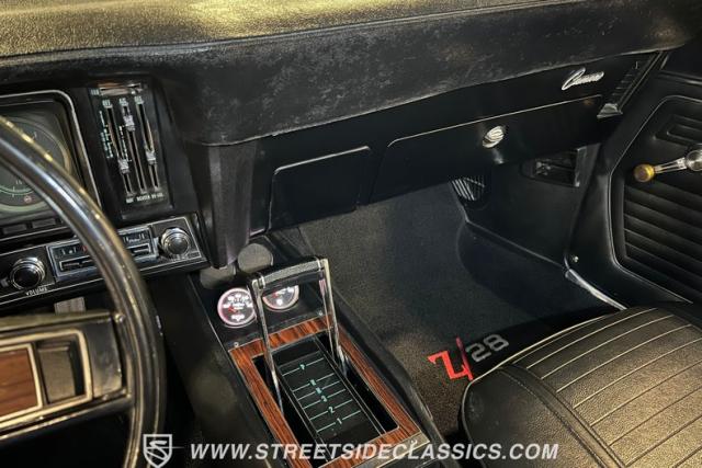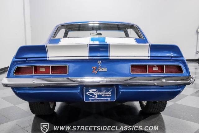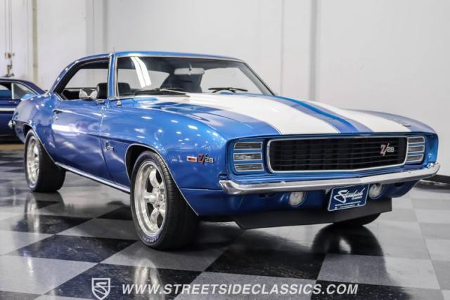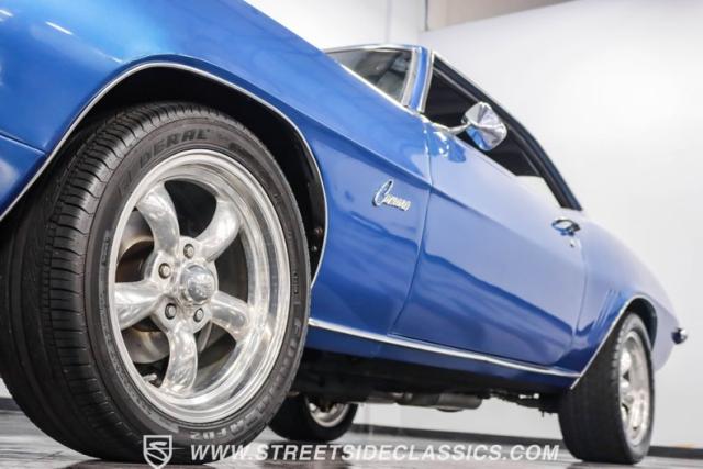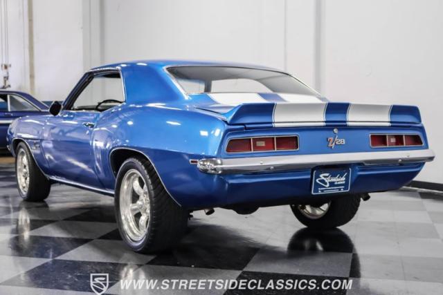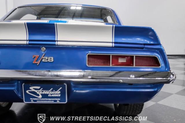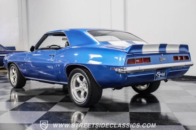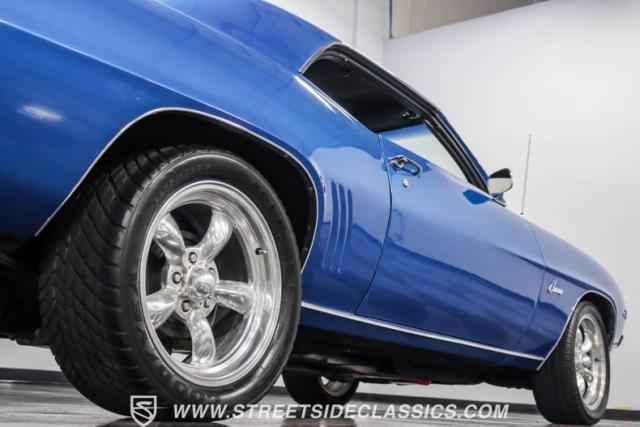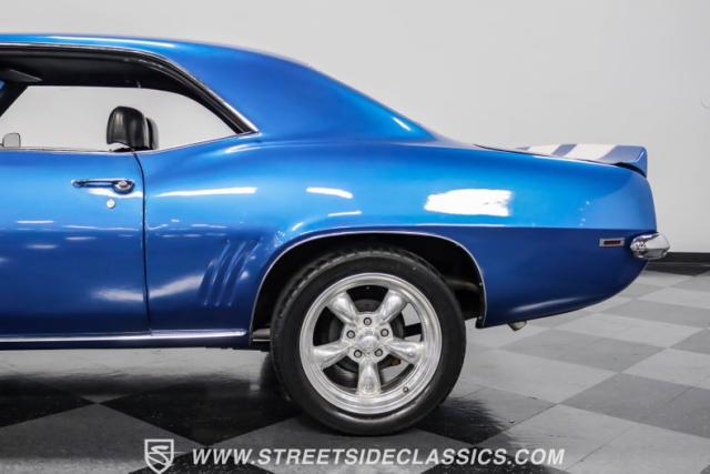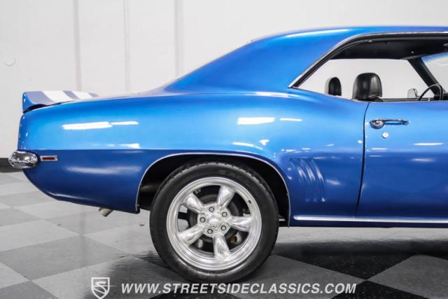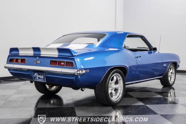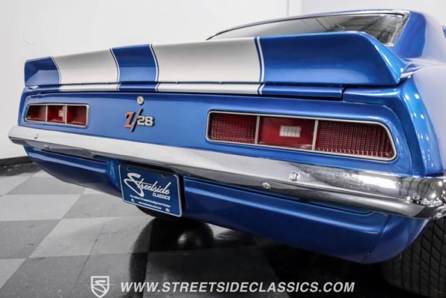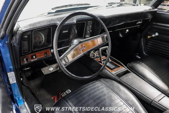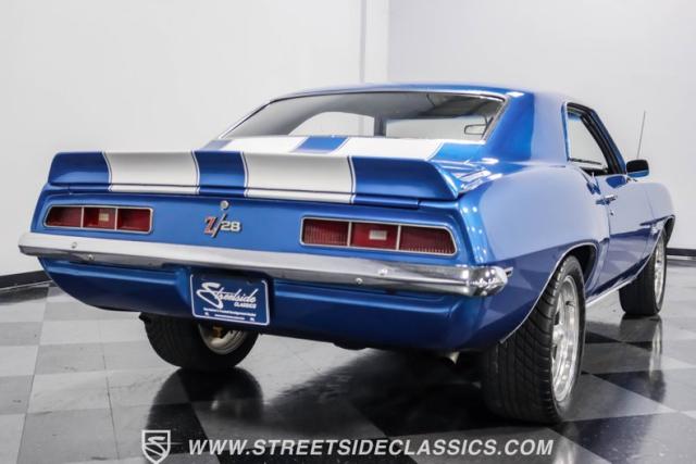 This restored classic 1969 Camaro Z/28 RS Tribute is finished beautifully in LeMans Blue with white rally stripes. The distinctive Rally Sport front end with concealed headlights and electric doors remarkably improves the great design of the Camaro. Additionally, a cowl hood, rear spoiler and chin spoiler make this classic even more desirable. A set of 17-inch polished torque thrust wheels wrapped with performance tires staggered 235/45ZR17 front and 275/40ZR17 in the rear complete the muscle car stance of this Camaro.