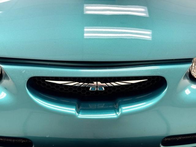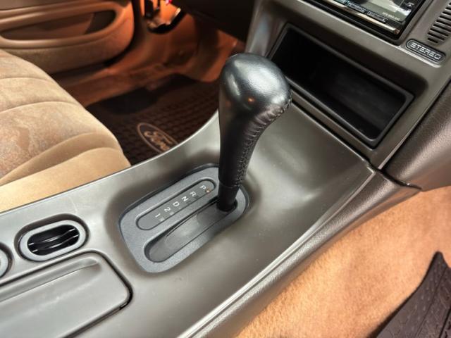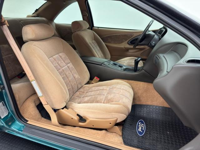 Available only in \'96 and \'97, this car wears two stage Pacific Green Metallic paint and it is in very nice condition, accented here with a two line pinstripe that hugs the shoulder line under the rounded edges of the wind defying profile. A sporty 4.6 High Performance emblem has been added to each front fender and the red simply pops off the green with contrast and the added chrome 15-inch Super Coupe wheels are a nice bit of aesthetic cred. Telltale Thunderbird emblems on the flush tail lights confirm identification if someone misses the scripted call out on the decklid and two exhaust tips, split wide, peak out from under the bumper cover. One area of some light scratches is the only imperfection we find on this well preserved Thunderbird.