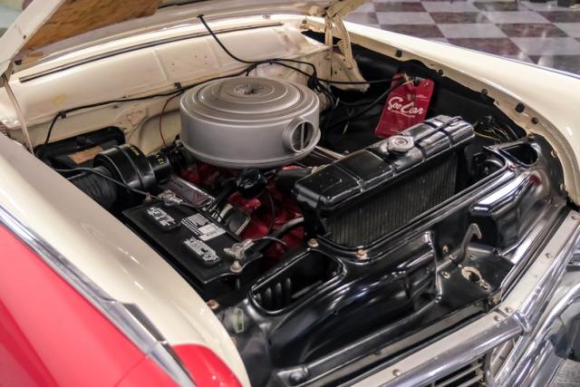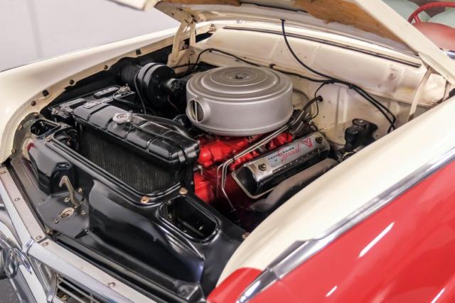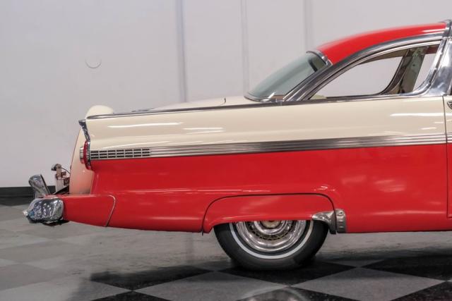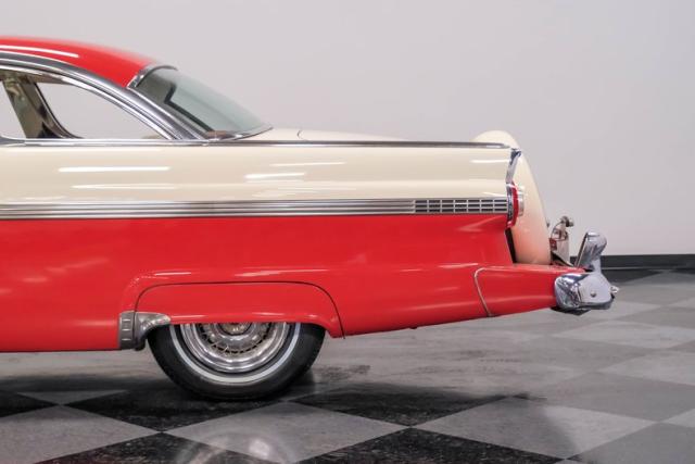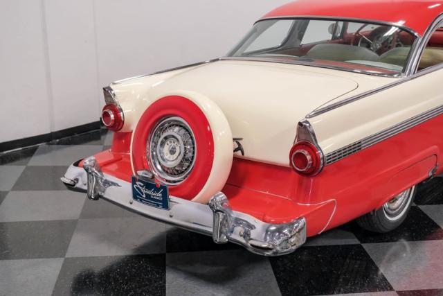 This car is an older restoration in handsome and factory correct Fiesta Red and Colonial White that has been well cared for and carefully driven. It features accessory rear fender skirts, Ford wire wheel hubcaps, a rear-mounted spare in a continental kit and dual exhausts with Cherry Bomb glass pack type exhaust for a wonderfully nostalgic sound.