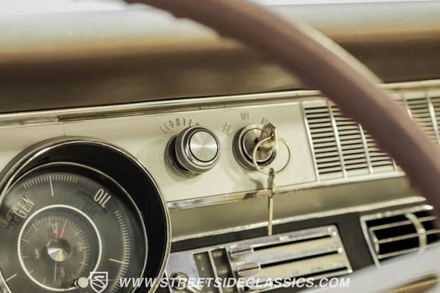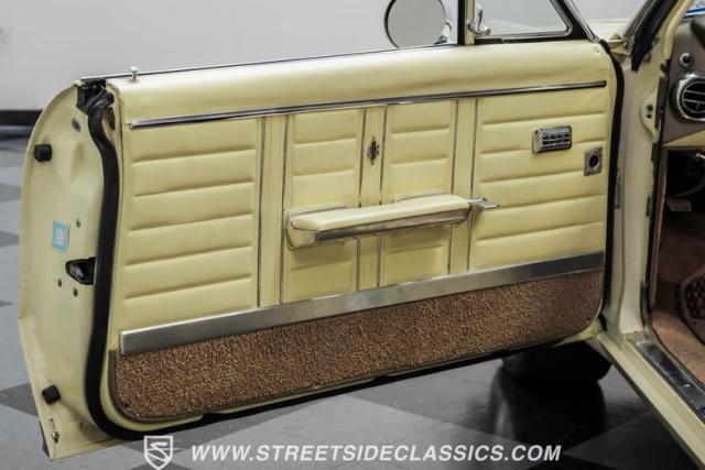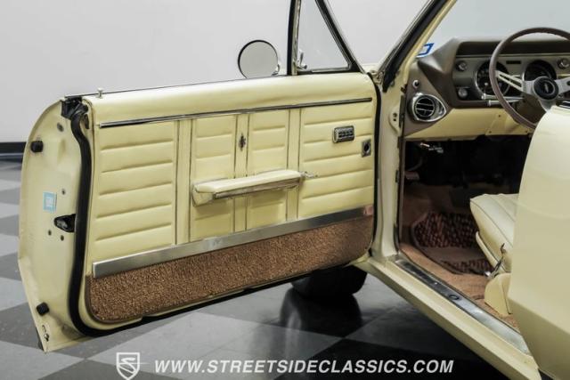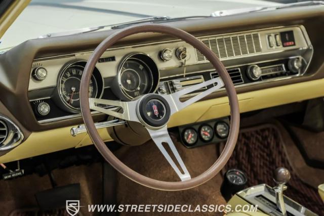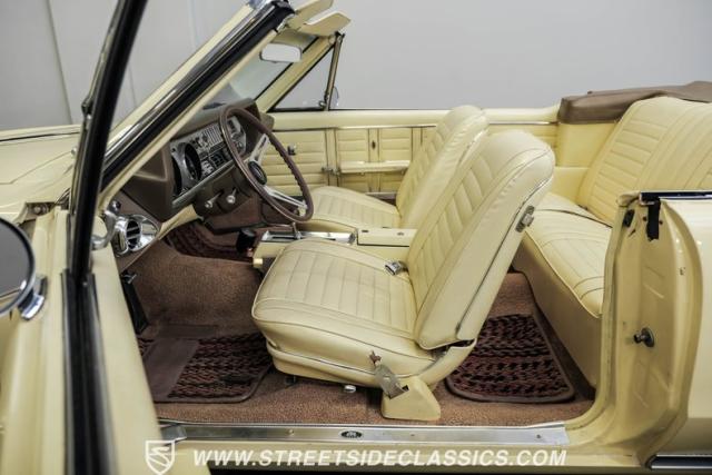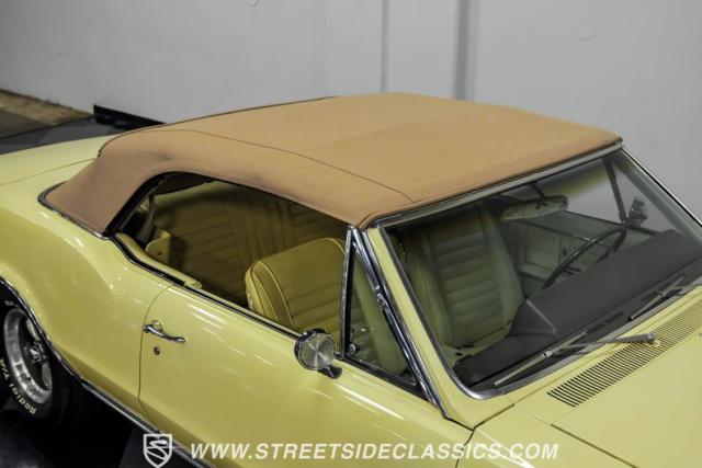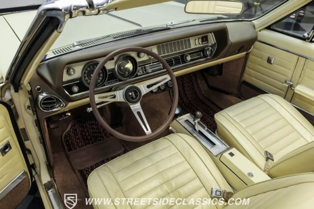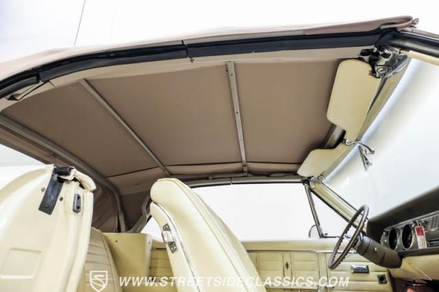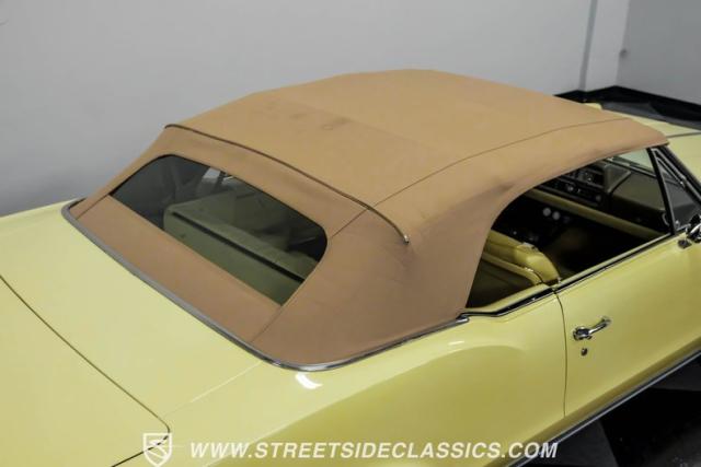 This 1967 Oldsmobile Cutlass 442 Tribute Convertible displays true muscle car DNA in brilliant (factory correct) Saffron Yellow. The athletic profile is amplified by REV 15-inch wheels, with BFGoodrich rubber measuring 225/60R15 up front and meaty 275/60R15 in the rear. The tan canvas convertible top adds sophisticated contrast, while the glass rear window maintains excellent visibility. The power-operated top mechanism allows easy open-air access on those perfect driving days.