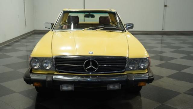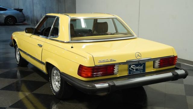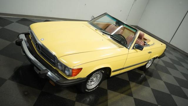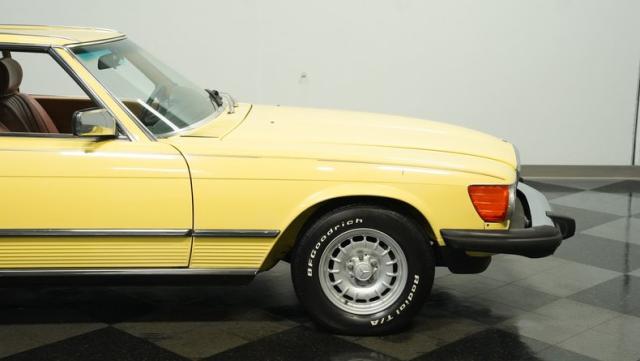 The 1982 Mercedes-Benz 380SL radiates luxury and performance in its Sunlight Yellow finish. This German roadster showcases the pinnacle of automotive engineering from the early 80s. Its sleek profile is accentuated by chrome accents and the iconic Mercedes grille. The power-operated beige canvas top provides open-air thrills, while the matching removable hardtop offers year-round versatility. Rolling on 14-inch wheels wrapped in 205/70R14 tires, this 380SL strikes an impressive stance on the road.