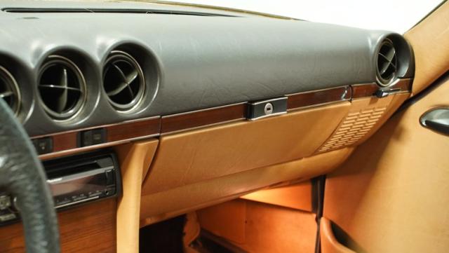 Inside, the Sand Beige leather interior exudes sophistication. The cabin features supportive bucket seats and a console-mounted shifter for the 4-speed automatic transmission. Power steering and brakes offer effortless control, while the AM/FM/AUX stereo with single CD player provides entertainment. The leather-wrapped steering wheel and wood trim accents reinforce the car\'s premium feel. The overall interior maintains its classic Mercedes charm.