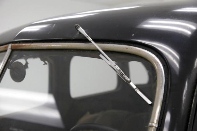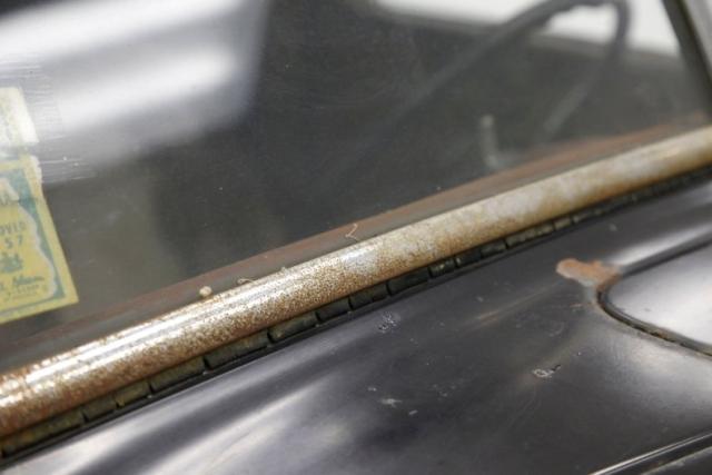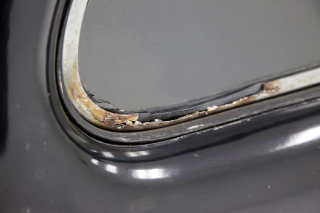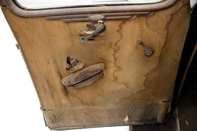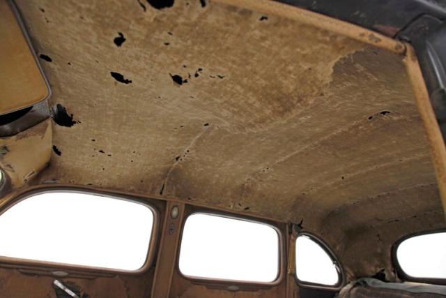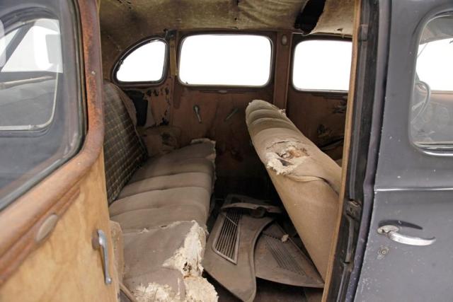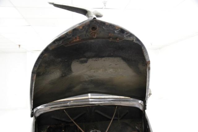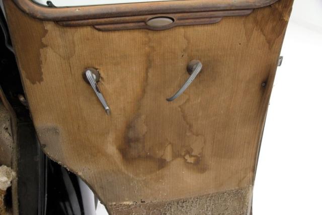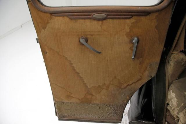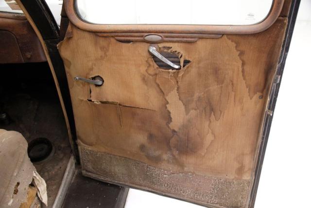 Inside, much TLC will be required as we note solid mohair lined door panels which have extensive water damage. Original cranks and actuators are on and appear in patina riddled and faded condition. Moving inside, more mohair tufted, tucked and wide rolled seats have several areas of damage , in the form of dry rot, wear through and water damage. When restored these will present beautifully in their Art Deco style. The dash is a full metal jacket, painted brown, and is very simply adorned with warm cream round sweep gauges. The dash steel is heavily surface rusted but all inserts knobs and pulls are present. It is fronted by a nice banjo style bakelite steering wheel with chromed central ribs. Above a mohair headliner is still tight but shows some holes, dry rotting, and water damage throughout. Down low, the floors are covered with rubber in front and water damaged and parts filled carpeting in back.