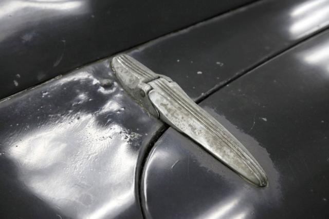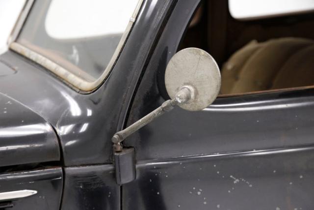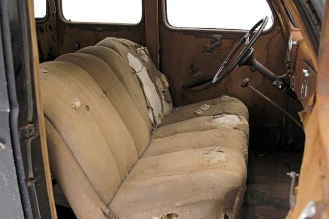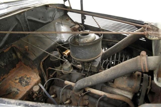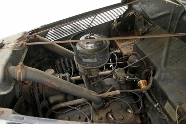 Under the hood is the factory 221ci V8 flathead engine. It has a single 2-barrel carburetor feeding it and its original oil bath air cleaner is topping the carburetor. On the back is a three speed manual transmission. The rear axle weighs in at 3.78. The engine and heads show surface rust and have gone unrestored but some newer parts have been put on as you can see the visual difference.