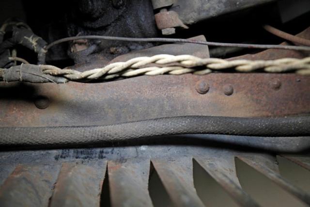 On the very back of this car some extensive invasive rust has taken away the rear mounting of the body from the framing. A new silver steel fuel tank is on along with a newer exhaust piping system. Everywhere else, including the floor pans, framing, and rockers are heavily surface rusted. Front and rear transverse leaf springs and mechanical drum braking is all around this undercarriage.