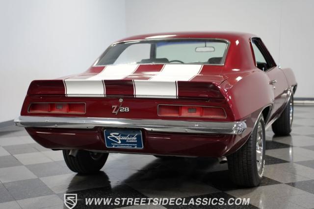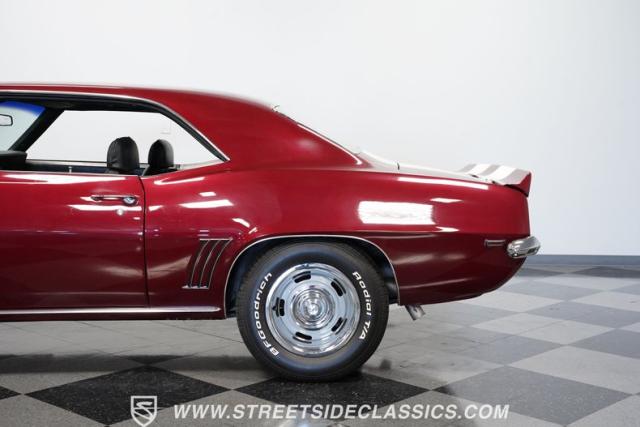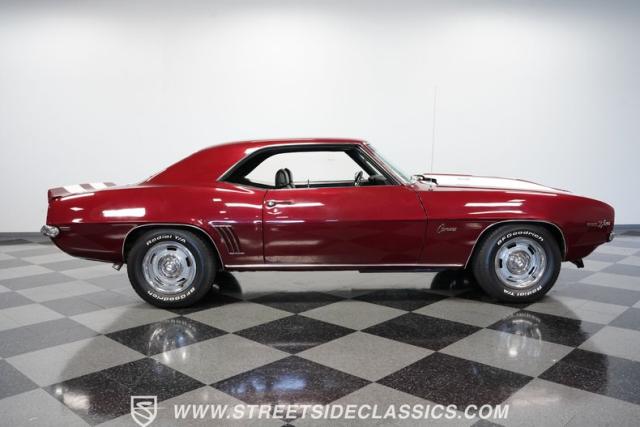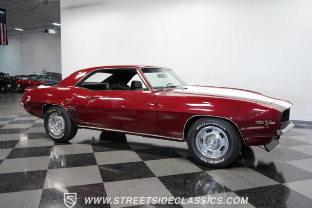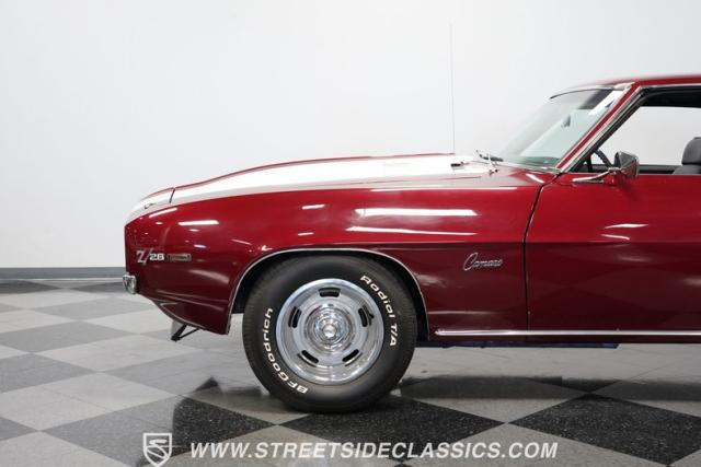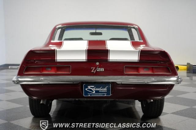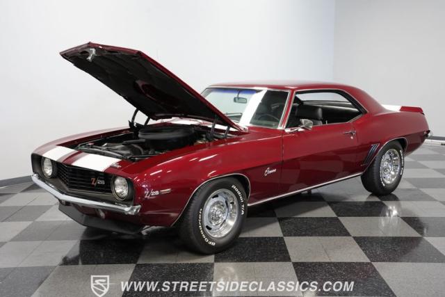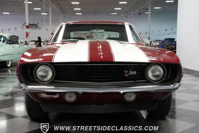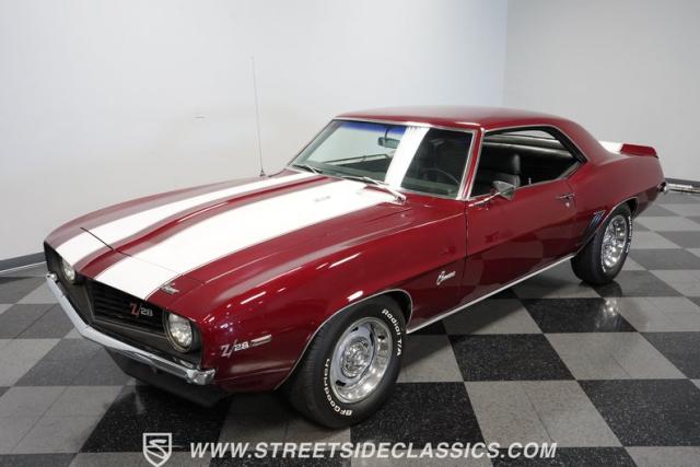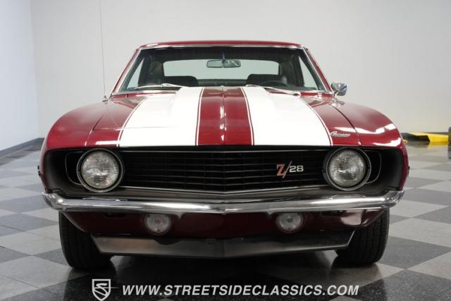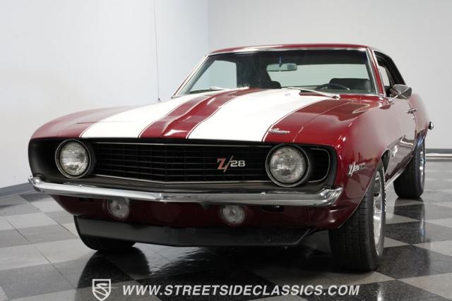 This 1969 Chevrolet Camaro Z/28 represents the best of late-60s American muscle car engineering. It wears a burgundy coat with subtle metallic flakes that sparkle in the sunlight. White racing stripes accentuate its aggressive profile, complemented by a cowl hood, front and rear spoilers, and authentic Z/28 badging. The car\'s stance is enhanced by 15-inch wheels wrapped in 225/70R15 tires, providing visual appeal and road-gripping performance. This Camaro Z/28 maintains its classic allure while offering an improved driving experience.