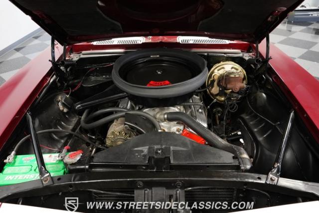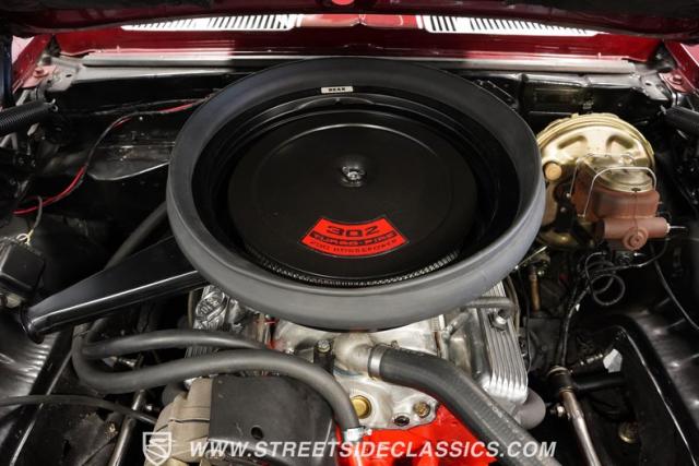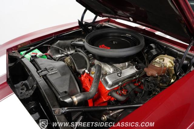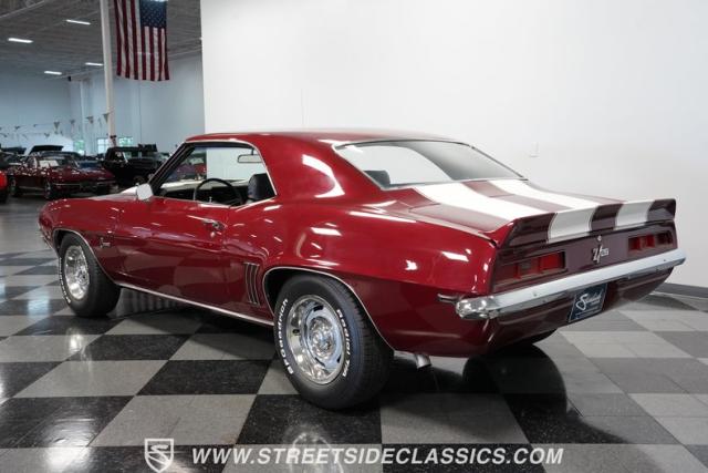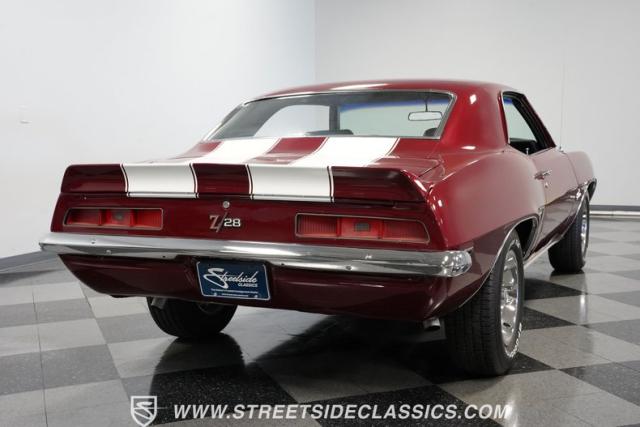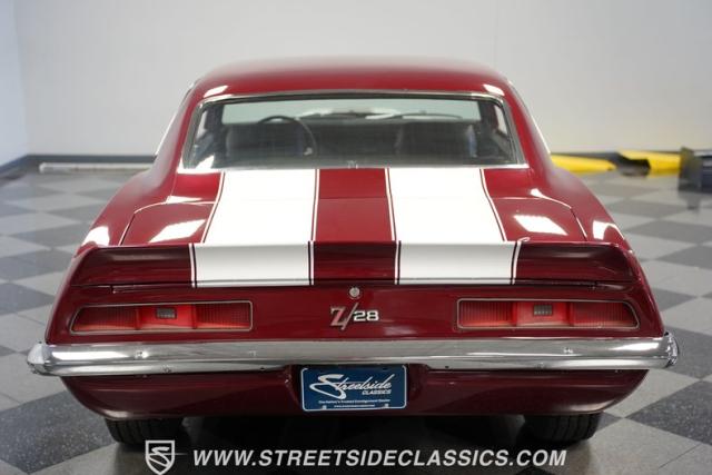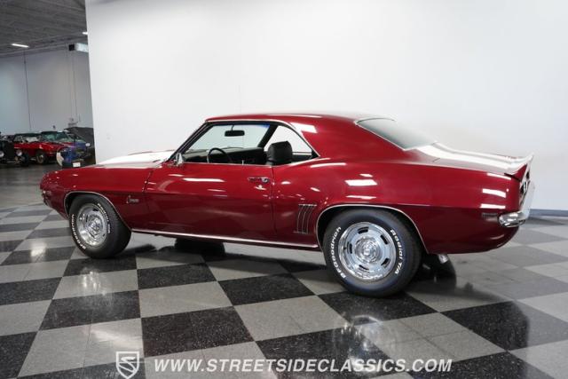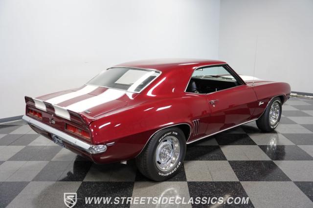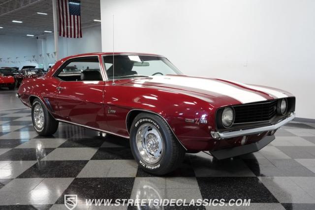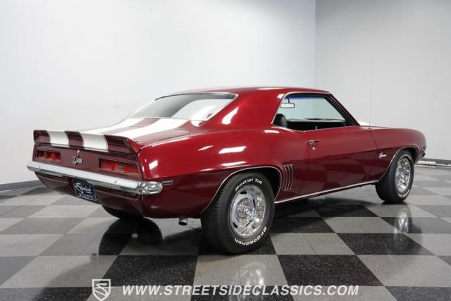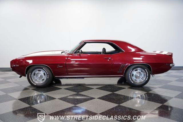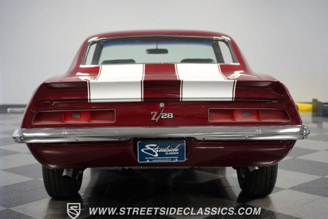 This 1969 Chevrolet Camaro Z/28 represents the best of late-60s American muscle car engineering. It wears a burgundy coat with subtle metallic flakes that sparkle in the sunlight. White racing stripes accentuate its aggressive profile, complemented by a cowl hood, front and rear spoilers, and authentic Z/28 badging. The car\'s stance is enhanced by 15-inch wheels wrapped in 225/70R15 tires, providing visual appeal and road-gripping performance. This Camaro Z/28 maintains its classic allure while offering an improved driving experience.