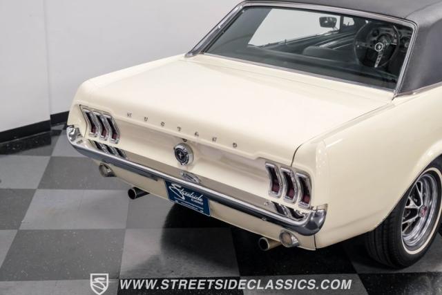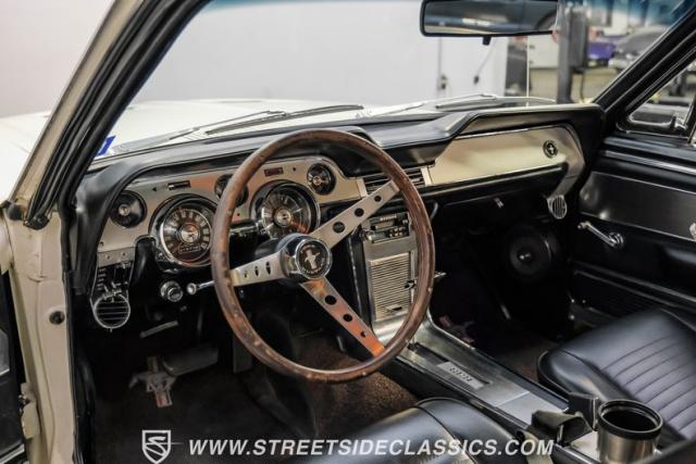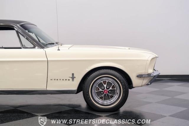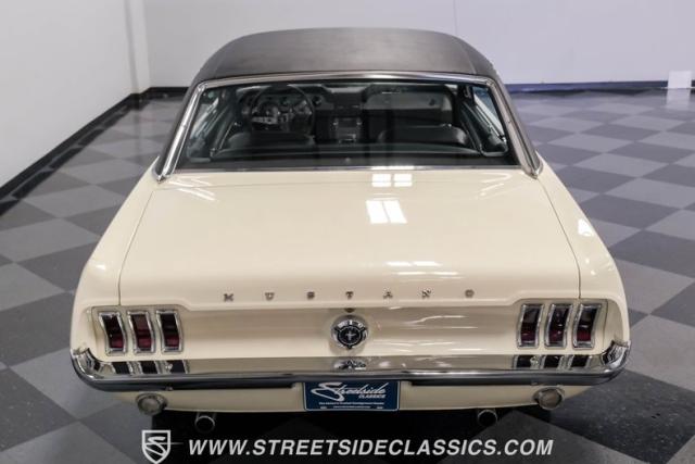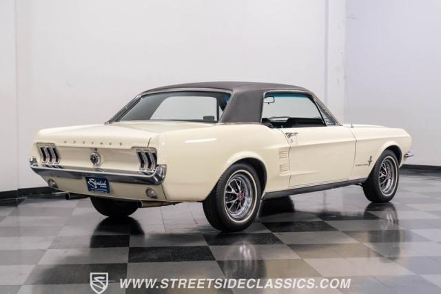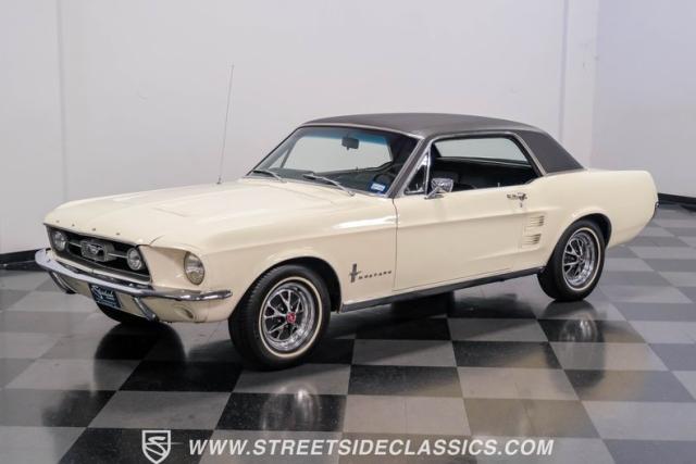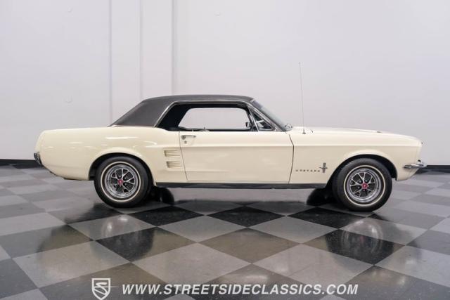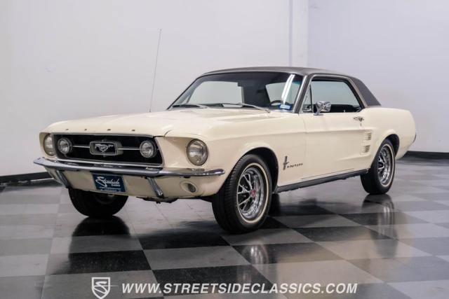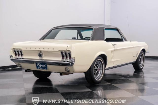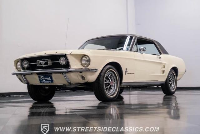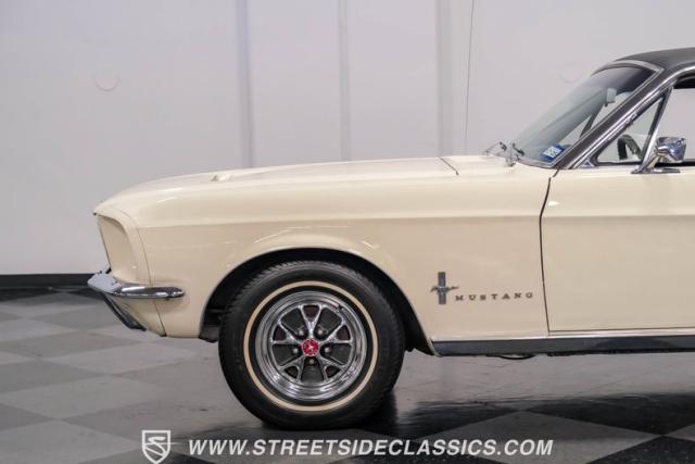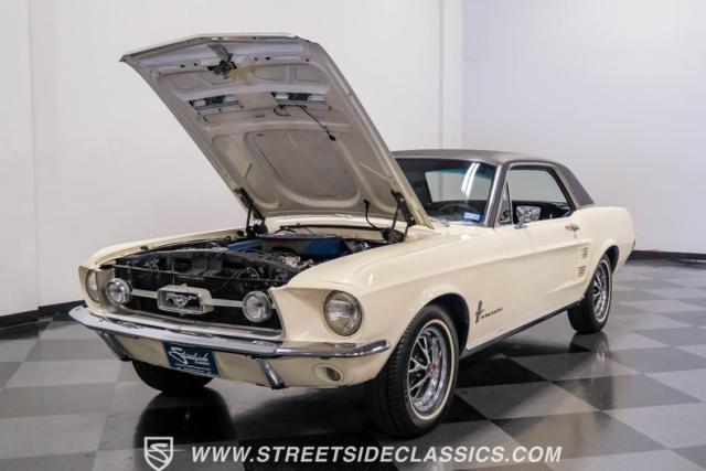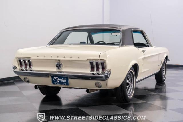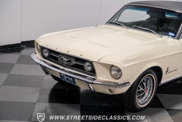 Restored approximately 25 years ago with many service items just within the last 5k miles, this 1967 Ford Mustang showcases an enduring Wimbledon White finish that radiates pure American muscle. The black vinyl top amplifies its athletic profile, while GT-style fog lights embedded in the grille signal its performance intentions. The distinctive hood vents and recessed turn signals forge an aggressive identity, riding on 14-inch Mustang steel wheels wrapped in Tiger Paw 205/75R14 tires. A dual exhaust system with H-pipe setup produces a deep, resonant voice.