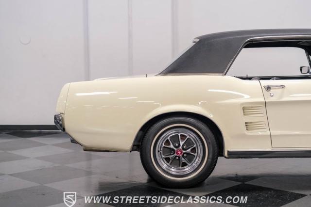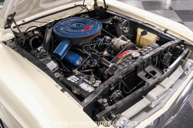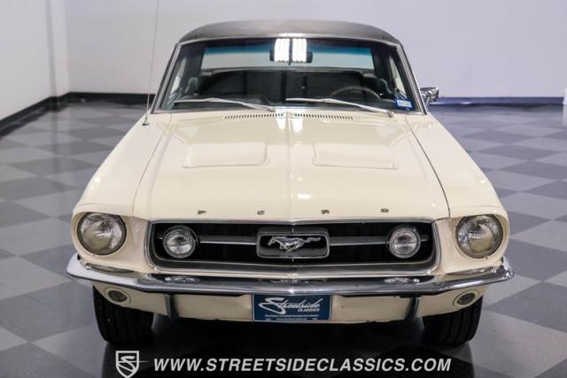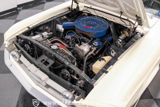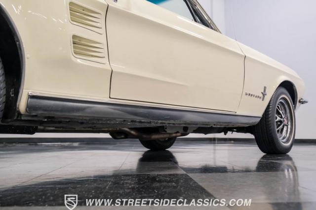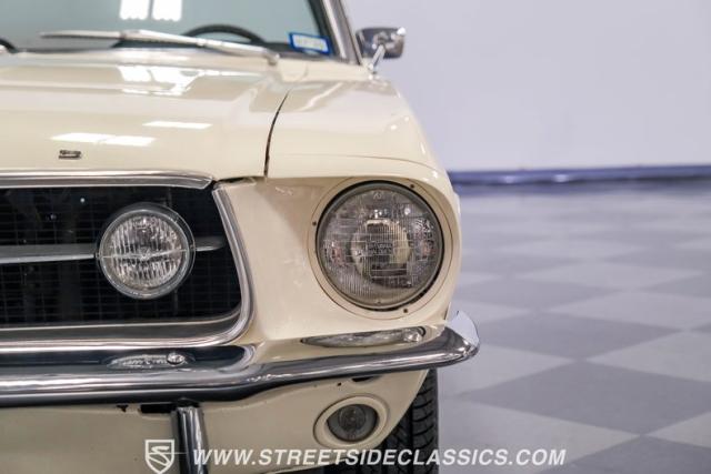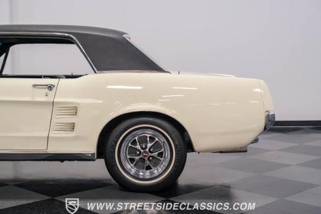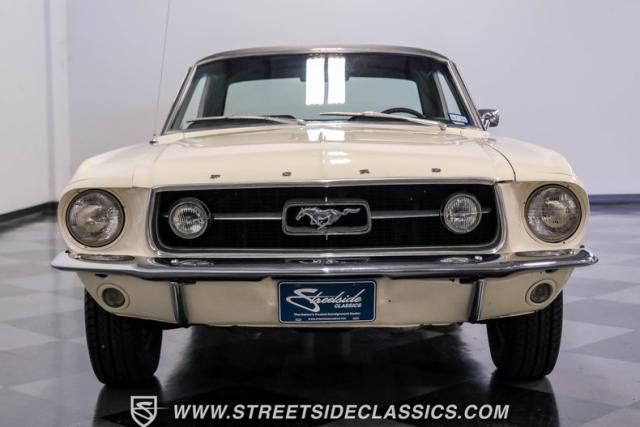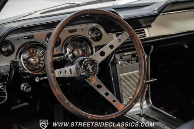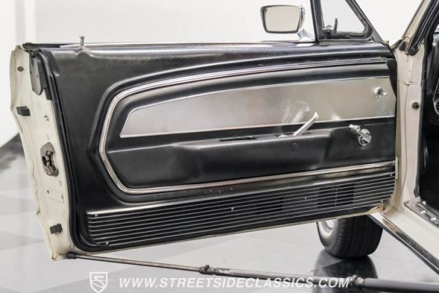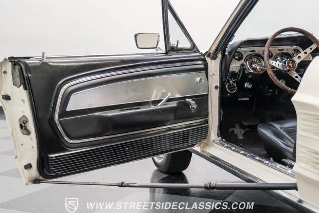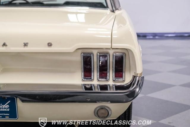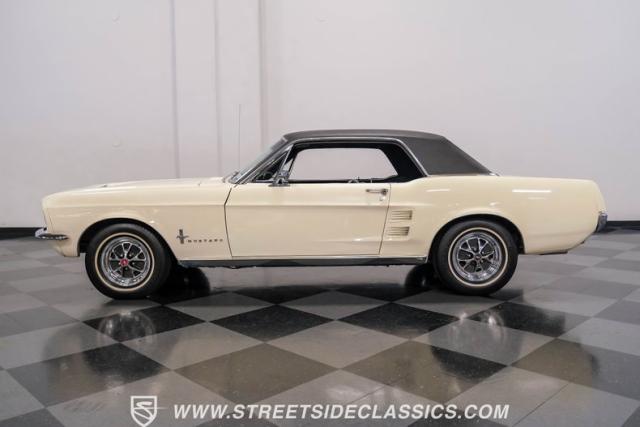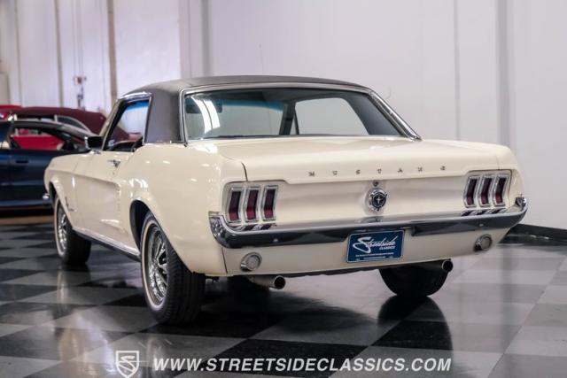 Restored approximately 25 years ago with many service items just within the last 5k miles, this 1967 Ford Mustang showcases an enduring Wimbledon White finish that radiates pure American muscle. The black vinyl top amplifies its athletic profile, while GT-style fog lights embedded in the grille signal its performance intentions. The distinctive hood vents and recessed turn signals forge an aggressive identity, riding on 14-inch Mustang steel wheels wrapped in Tiger Paw 205/75R14 tires. A dual exhaust system with H-pipe setup produces a deep, resonant voice.