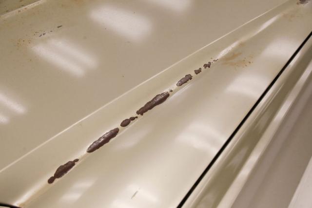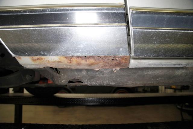 Up on the lift we can see the meat of the operation from underside, and note power steering, power front disc brakes and power rear drums, a new single exhaust system and the usual suspects having some surface rust. The frame is sturdy as are rockers and floor pans. Independent with coil springs in front, and a 4 link with coil springs has the rear covered. Nothing but black and patina under here along with a new fuel tank, sending unit and fuel hoses.