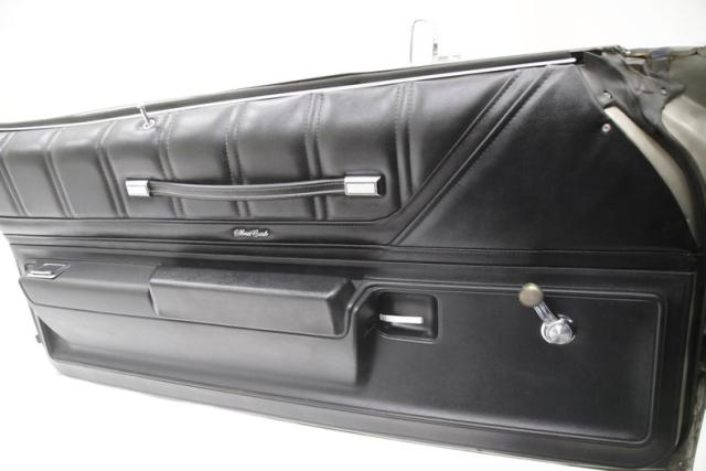 Black is the color for the interior, and this is exactly the material this Monte was born with. Black vinyl covers the optional swivel bucket seats with virtually no marks or stains and certainly no rips or tears and the rear bench follows suit and appears to never have been sat in. Running between the buckets is a black plastic console with a small glovebox at the rear, the automatic shifter, and 2 storage cubbies at the front just under the dash. The door panels are very clean vinyl covered with all working cranks, a black leather pull, and even the ashtray for the rear passenger. A black vinyl padded dash covers the passenger side, and faux burl veneer fronts the dash from centerline to driver\'s door. All gauges, which are the standard layout, reside within the burl and outboard on each side are twin warning light pods and a clock. Standard GM Monte Carlo steering wheel with more faux burl fronts the dash. Heat and A/C controls reside in the center of the dash and just below is factory AM/FM radio. Original black carpet, showing very well, is beneath all the seating. A nice tight black cloth headliner is above all this luxury and originality.