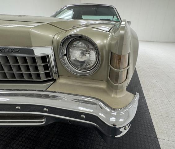 Silver Taupe Metallic paint, done right from the factory, plenty of brite work, and a black vinyl Landau top drape this \'74 \"Luxo-Mod\" (Look! Up in the sky, it\'s a muscle car!...no its a luxury car!..). The only paint work performed was due to scratches incurred during shipping causing the hood and trunk lid to be repainted. We note clearcoat has been applied over the faded area of the aforementioned panels. True to form 1974 second gen Monte Carlo through and through, it sports a long, long hood, and almost as long trunk deck. All badging trim work and chromed bumpers are very clean and dimple and rust free. A slight frown for the landau top which shows some areas of the wear and splitting of the vinyl, though the top remains rust free underneath. Rally wheels and tires are noted on all 4 corners, but we do note a 205/75R15 tire on the driver\'s front while the other tires are 225/75R15\'s