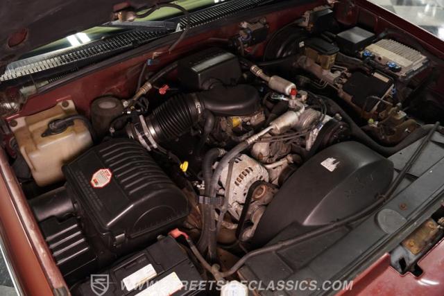 Like the interior, the drivetrain is believed to be original. The engine bay hosts a 5.7-liter V8 connected to a 4L60E 4-speed automatic transmission that links to an 8.5-inch 10-bolt rear axle. The front suspension is a stock independent setup with torsion bars, and the rear is stock with leaf springs. Fifteen-inch stock wheels are wrapped in 235/75R15 tires, and behind those are front power disc brakes and rear power drum brakes. The exhaust is a stock-style dual exhaust that runs into a stock muffler and exits as a single exhaust.