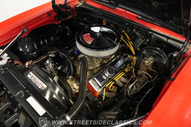 Under the hood, the engine bay is well put together with chrome Edelbrock valve covers and an air cleaner cover. A black painted firewall and fenders frame the 350 cubic-inch V8 engine, equipped with an Edelbrock carburetor and intake. Power is delivered through a TH350 3-speed automatic transmission to a 10-bolt solid rear axle. The front suspension is an independent setup with control arms and coil springs, while the rear uses leaf springs and air shocks. The 15-inch Rally wheels with beauty rings and center caps are wrapped in Uniroyal 215/65R15 front tires and 235/60R15 rear tires. For stopping power, front and rear drum brakes handle the duties, while long-tube headers, dual exhaust, and Flowmaster mufflers make this Camaro sound like a true muscle car.