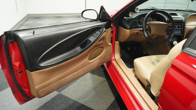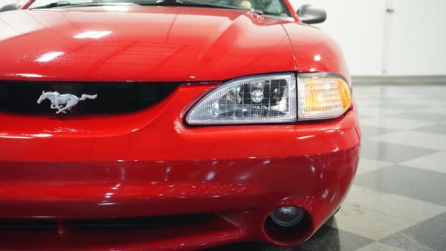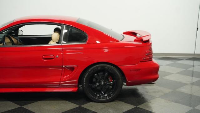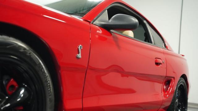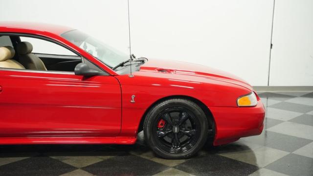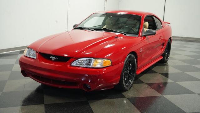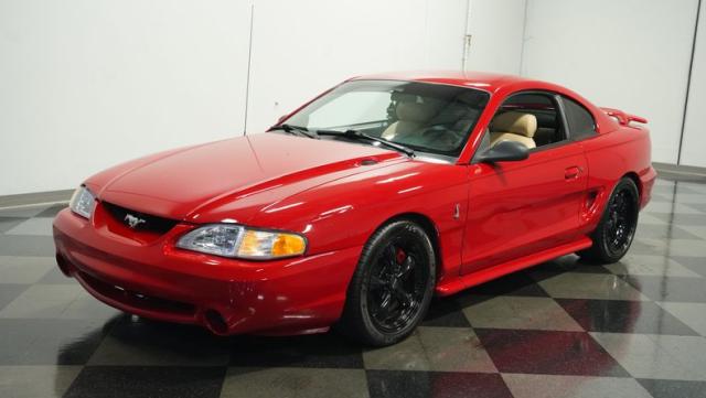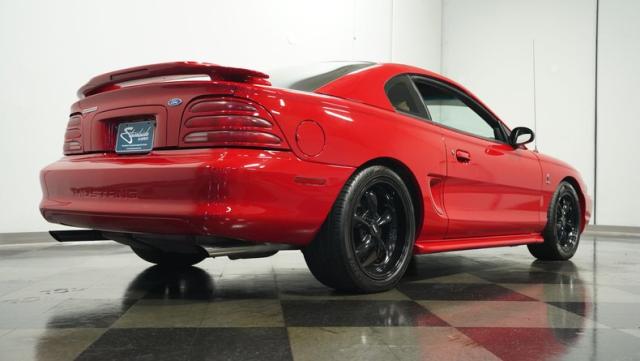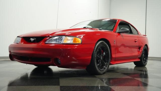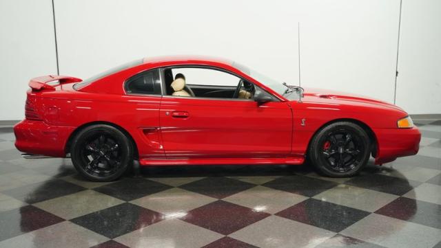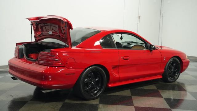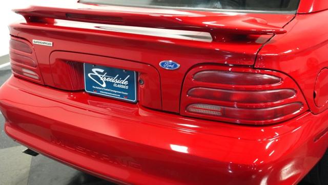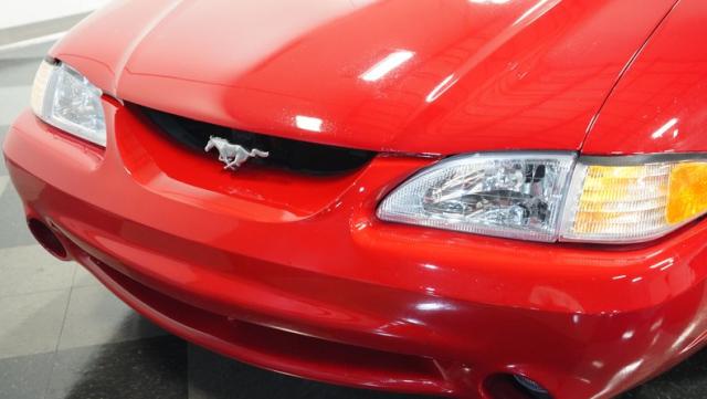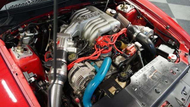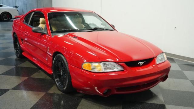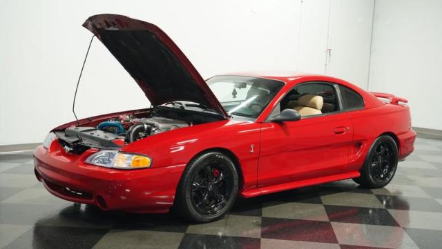This 1994 Ford Mustang SVT Cobra Procharged boasts a rare pedigree - it\'s one of only 1,000 Cobras produced that year. Cloaked in Rio Red, this SN95 Mustang exemplifies the evolution of Ford\'s pony car. The staggered wheel setup, with 17-inch fronts and 18-inch rears, gives it an authoritative stance. Massive 245/45R17 front and 285/35ZR18 rear tires provide serious grip. A fiberglass hood with a functional scoop announces the forced induction powerplant, while Cobra-specific bodywork sets it apart from garden-variety Mustangs.