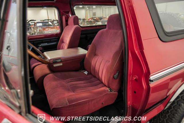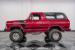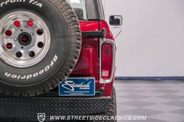 Deep gloss maroon metallic paint with a Black painted Mach 1 style stripe gives this classic Bronco a unique, sporty look that pays homage to the great company\'s performance history. Up front is an impressive custom front bumper fitted with a winch, fog light and LED light bar to help blaze trail at night. A heavy-duty custom bumper is also in the rear of the Bronco, along with a matching spare wheel and tire on a swing-out mount.