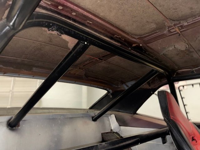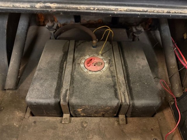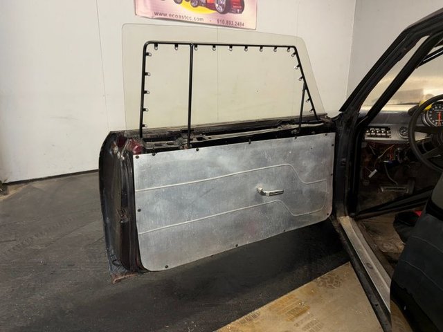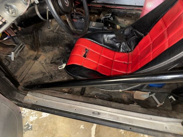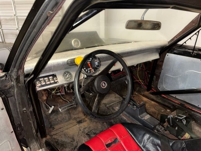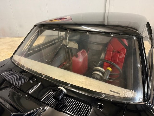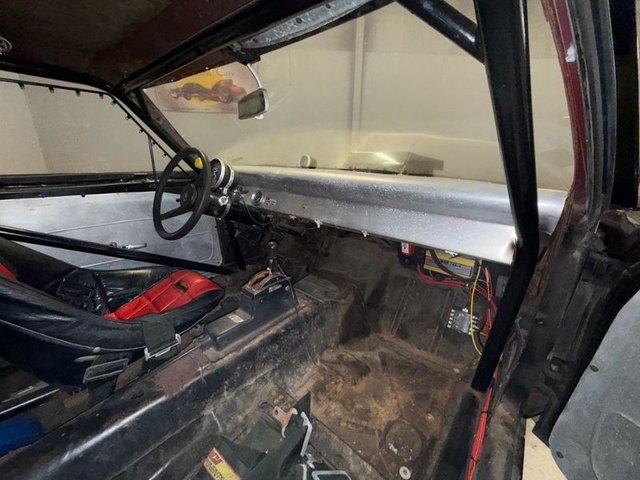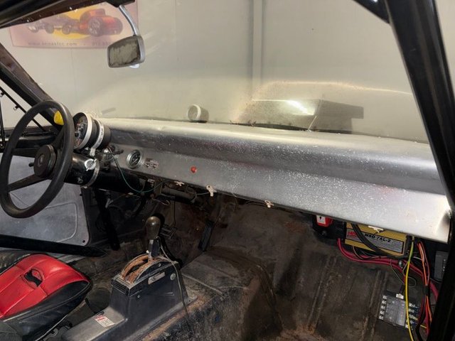 There are race bucket seats that are Red and Black with REI Racing belt, roll bar, Autogauge brand aluminum dash with water and oil gauge in it. Autometer tach mounted on steering column, toggle switches on dash, starter, ignition, fuel, water pump, fan, black steering wheel and column, Winters automatic shifter, aluminum door panels, back side panels and back seat panel. Aluminum package tray panel. Stock door sill plates. Nice inside.