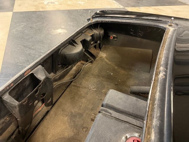 Painted black with a chrome bumper front and rear, chrome door handles, all window are plexiglass, aftermarket hood scoop is fiberglass and added to steel hood. No wipers, grill, side marker lights, removeable trunk steel. Tail lights, headlights, new front tires on aluminum centerline rims, fenderwells. Looks good.